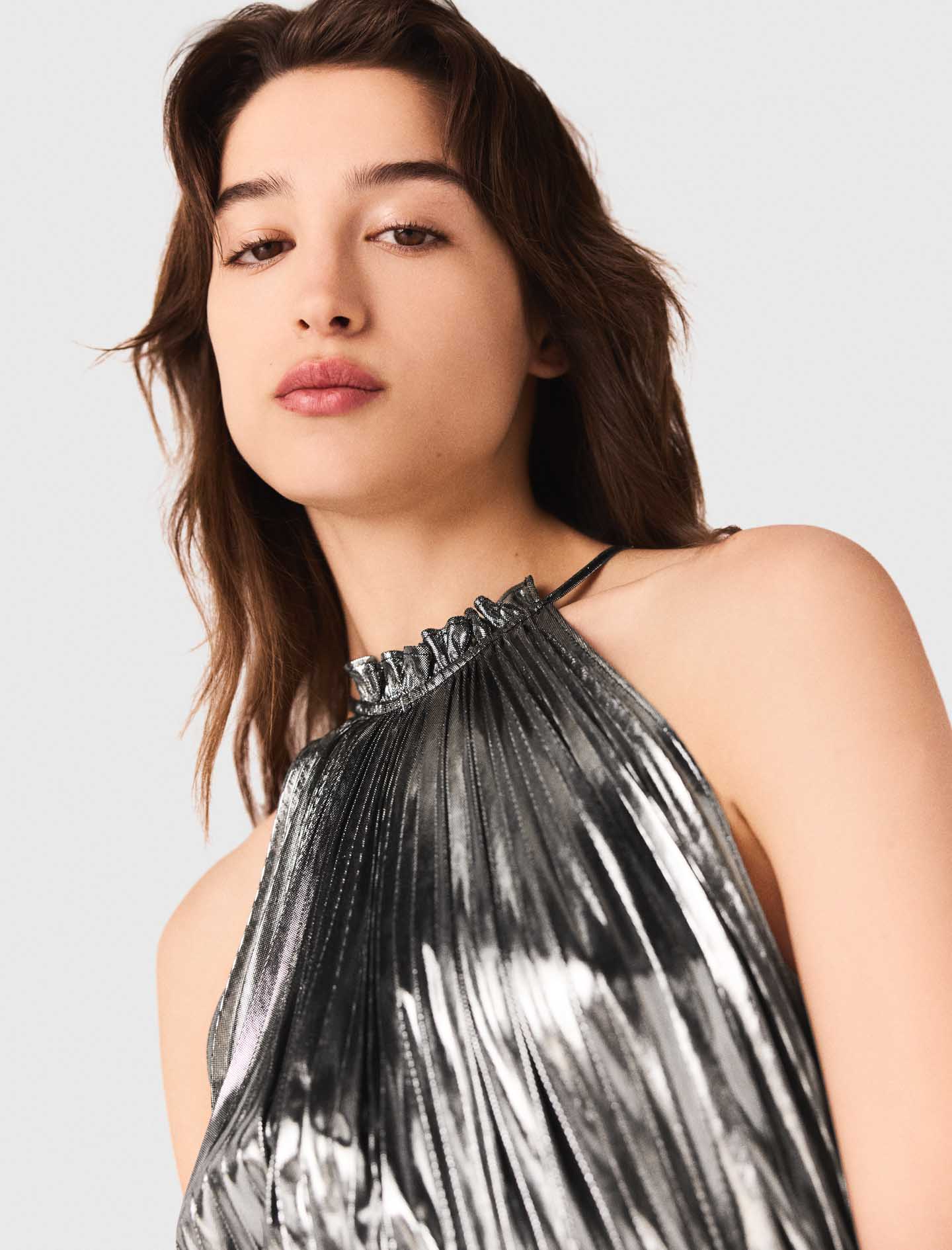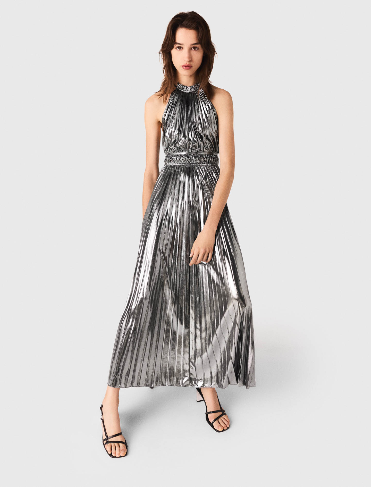The flowing, structured pleats catch every reflection, accentuating a slim silhouette.