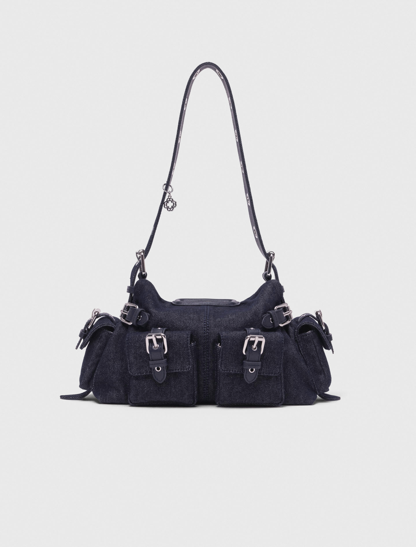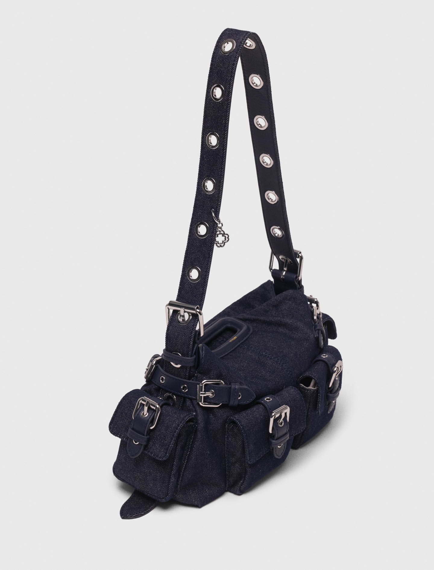 Maje cotton Miss M Pockets bag in denim Raw denim pocket detail Handle adorned with eyelets Flap closure