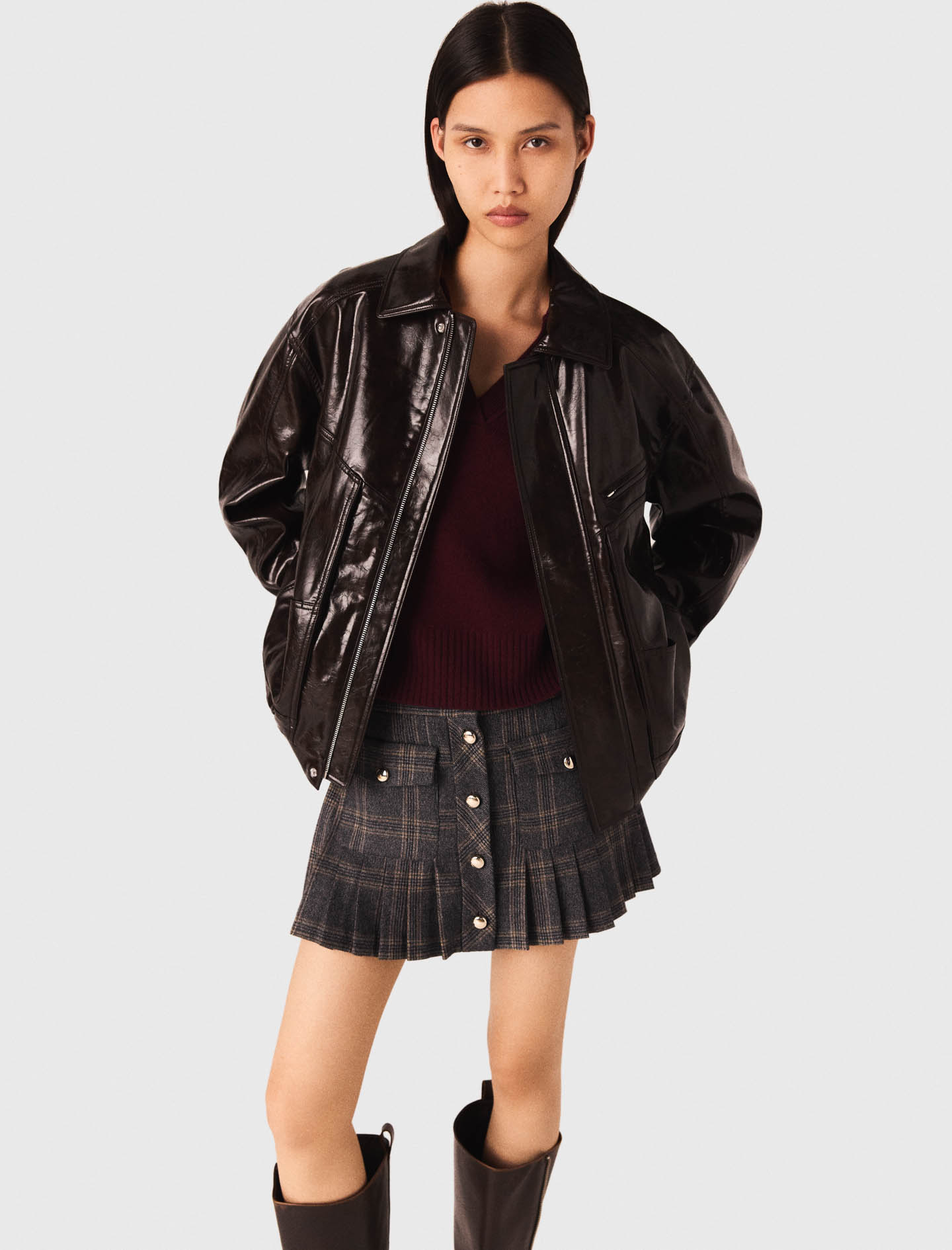 Wear with a pleated mini skirt and statement boots for an uncompromising look..