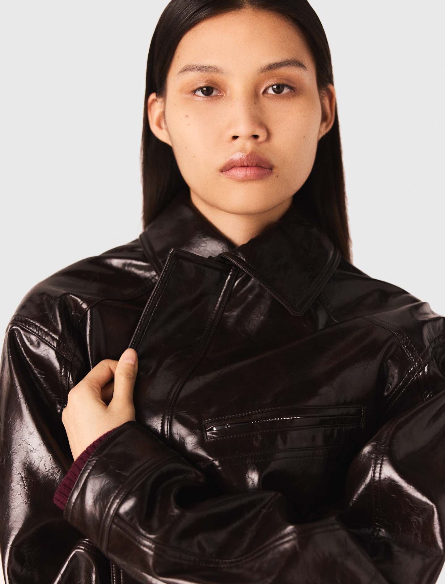 Maje viscose Cracked faux leather jacket Long sleeves with buttoned cuffs and an elasticated waist Patch pockets and a zipped chest pocket Designed for an oversized fit In an autumn wardrobe that's full of personality, faux leather pieces stand out with their metropolitan, contemporary feel.