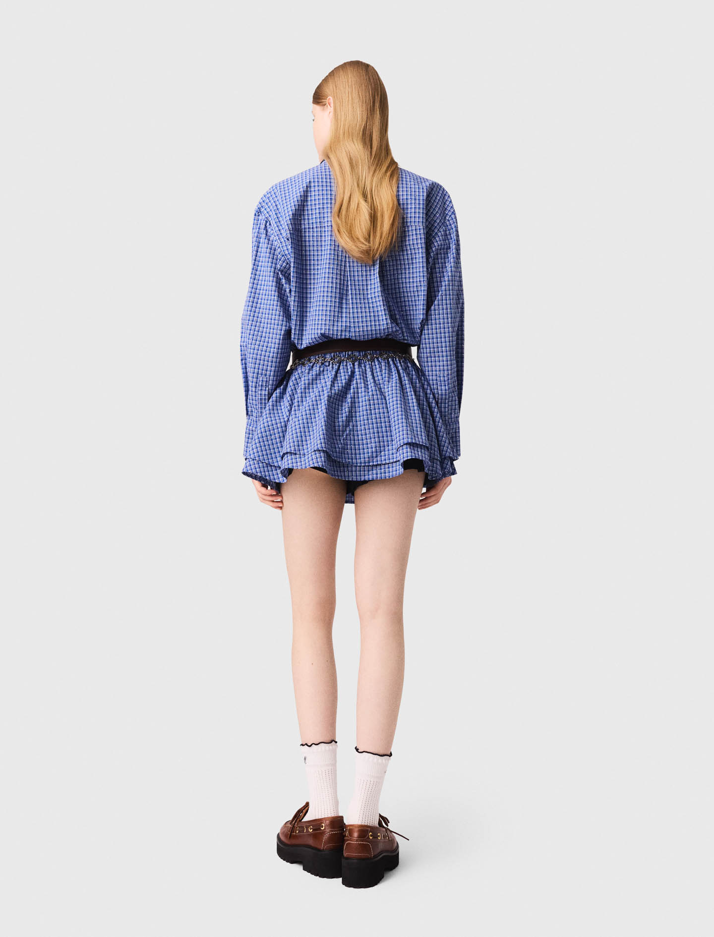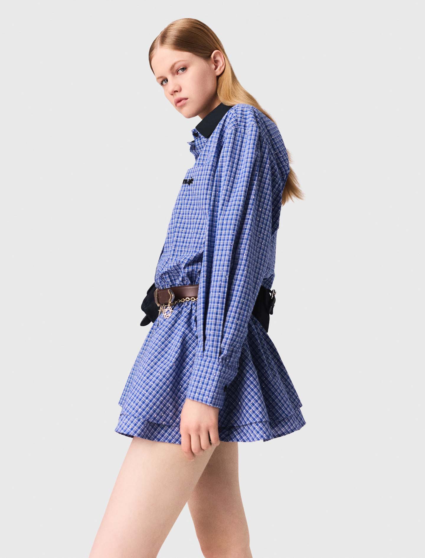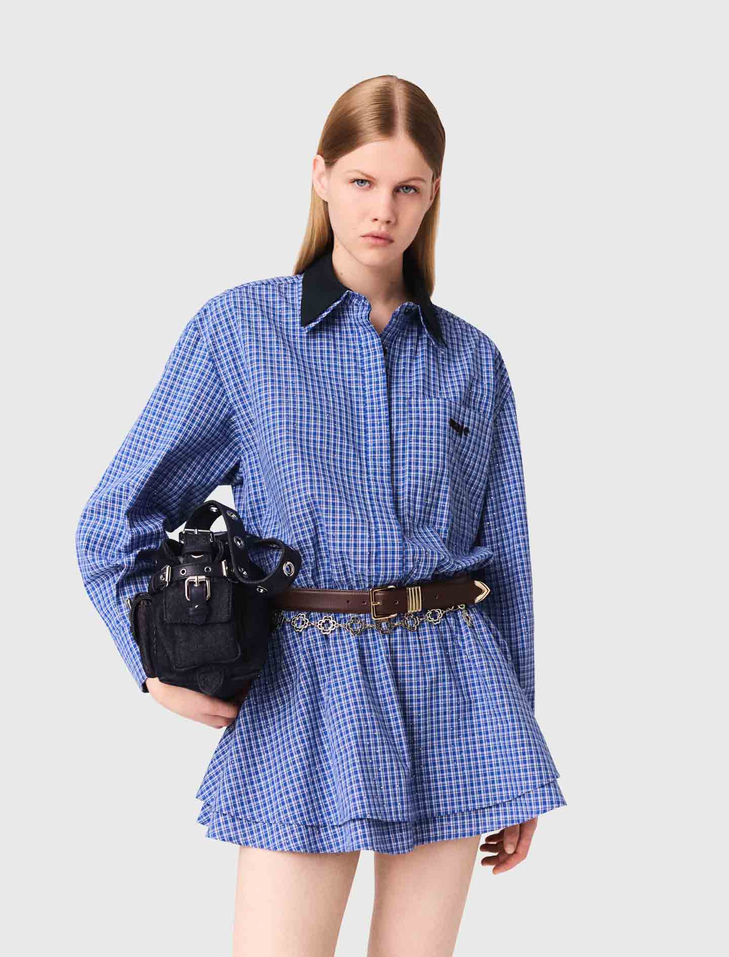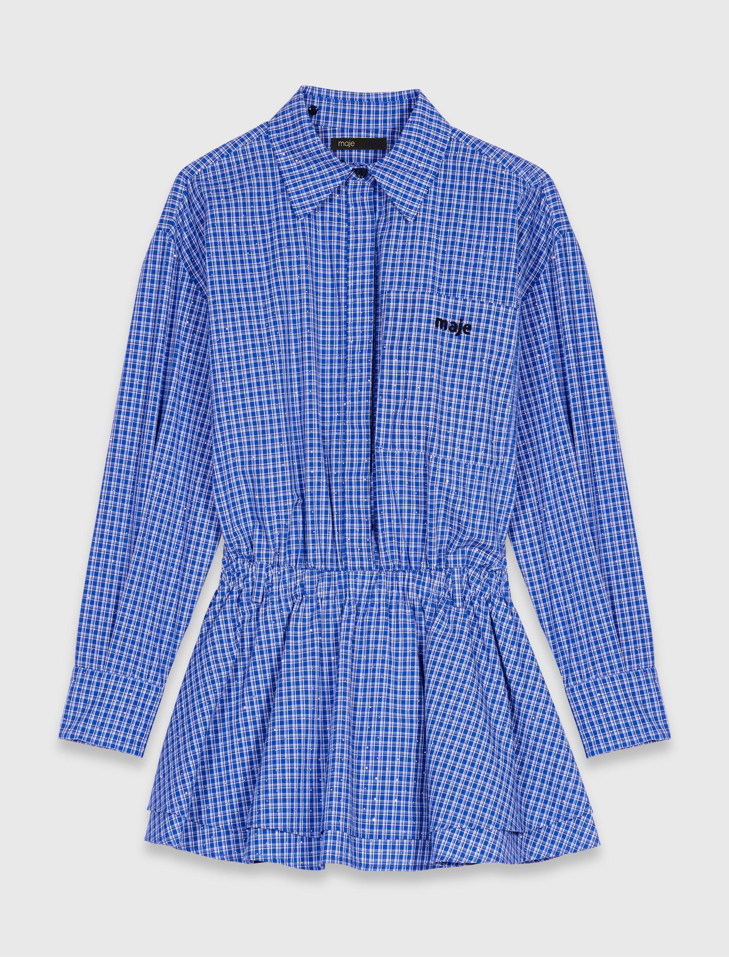 Maje cotton Dress-style playsuit Check patterns with rhinestones Double collar with one removable contrast Button fastening with covered placket Elasticated waist Patch pocket with Maje embroidery on the chest Designed for a standard fit Maje offers a collection where the new energy of the season blends with timeless elegance.