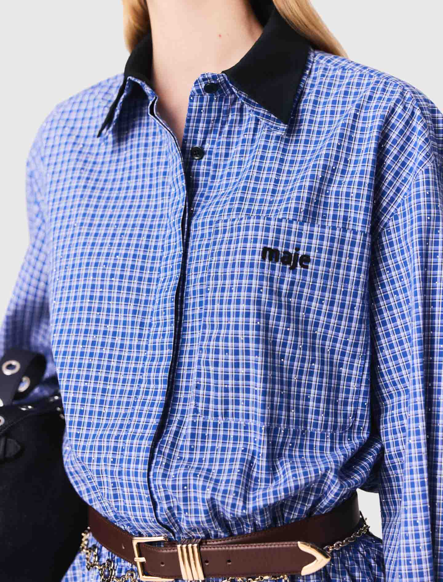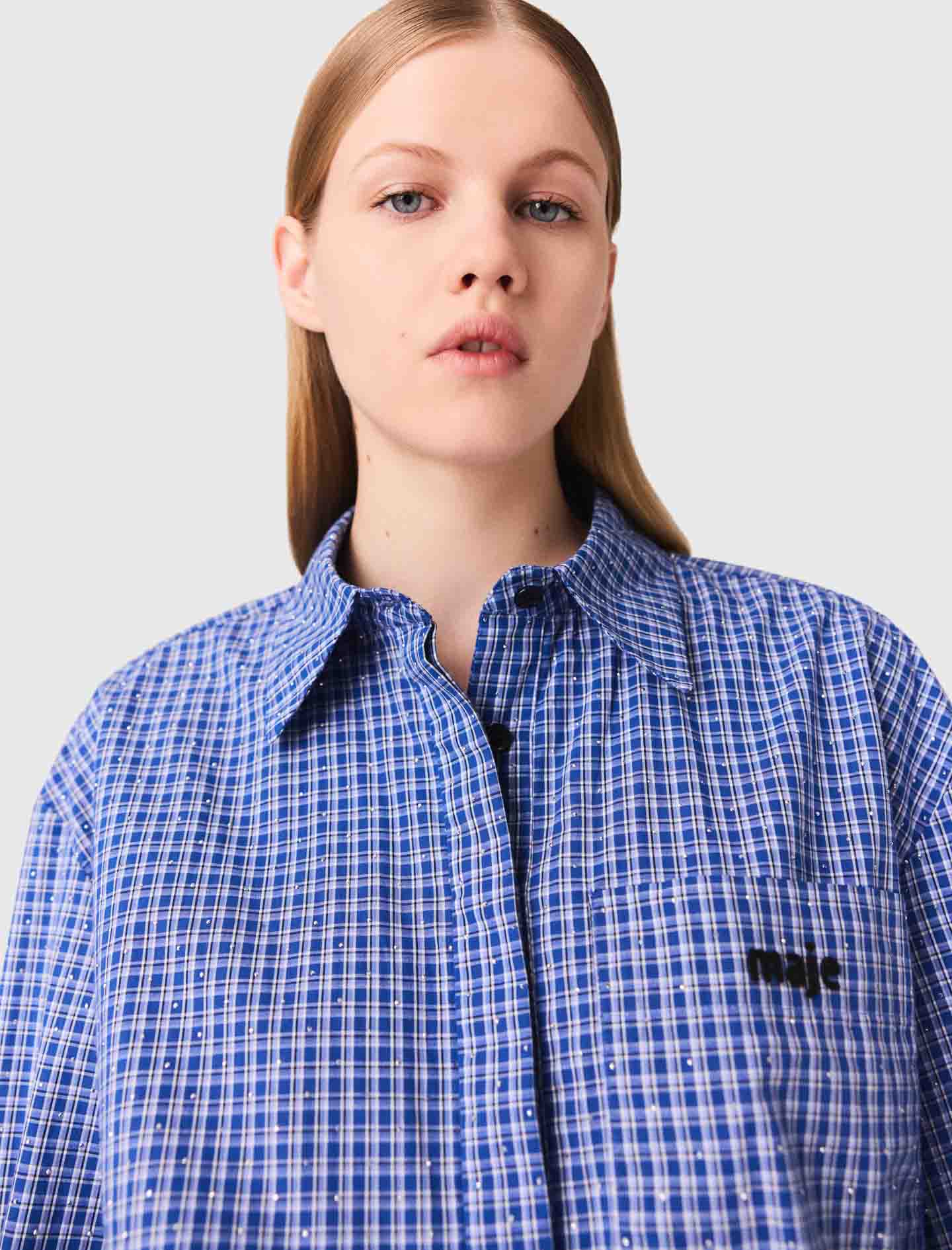 This dress-style playsuit in stretch cotton features a check print with sparkling rhinestones and a patch pocket on the chest with raised Maje embroidery.