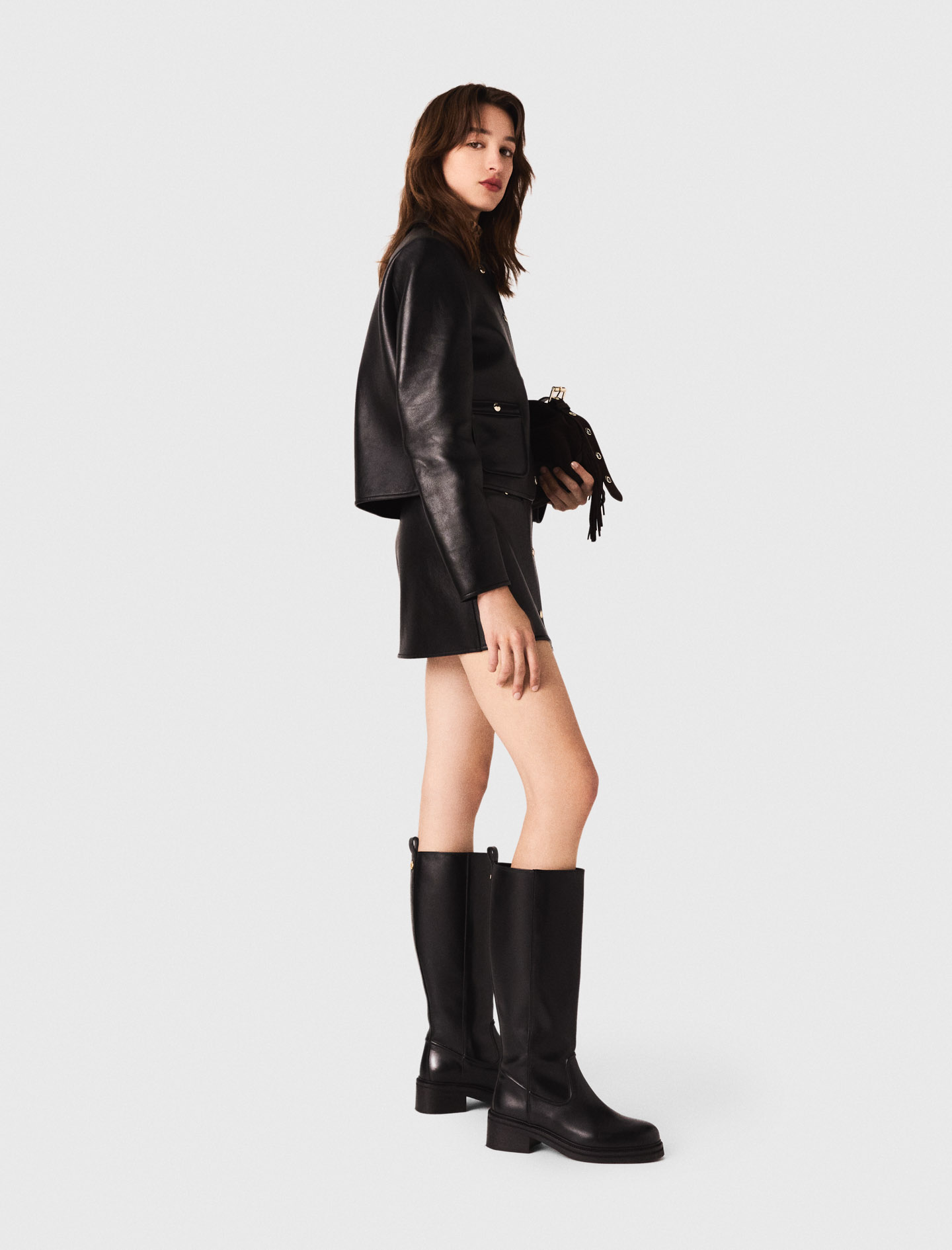 Maje leather Short leather jacket Gold button fastening 2 patch pockets Designed for a boxy fit This season, wardrobe essentials are taking on a bolder edge.