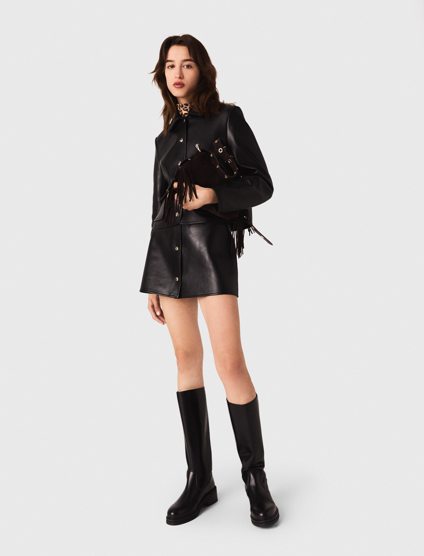 Pair it with a short leather skirt and riding boots for a confident head-to-toe look, with a twist from a leopard-print turtleneck and a signature bag..