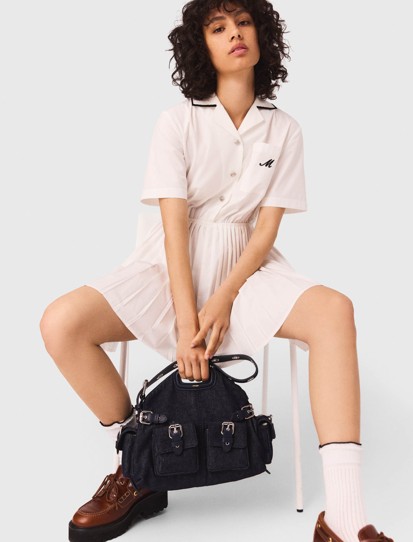 Maje polyester Pleated poplin dress Knit collar with contrast piping Decorative button top Short-sleeved M-embroidered patch pocket Pleated flared skirt Designed for a boxy fit Inspired by the waning days of summer, this collection captures the essence of a woman drifting somewhere between Saint-Tropez and Cassis.
