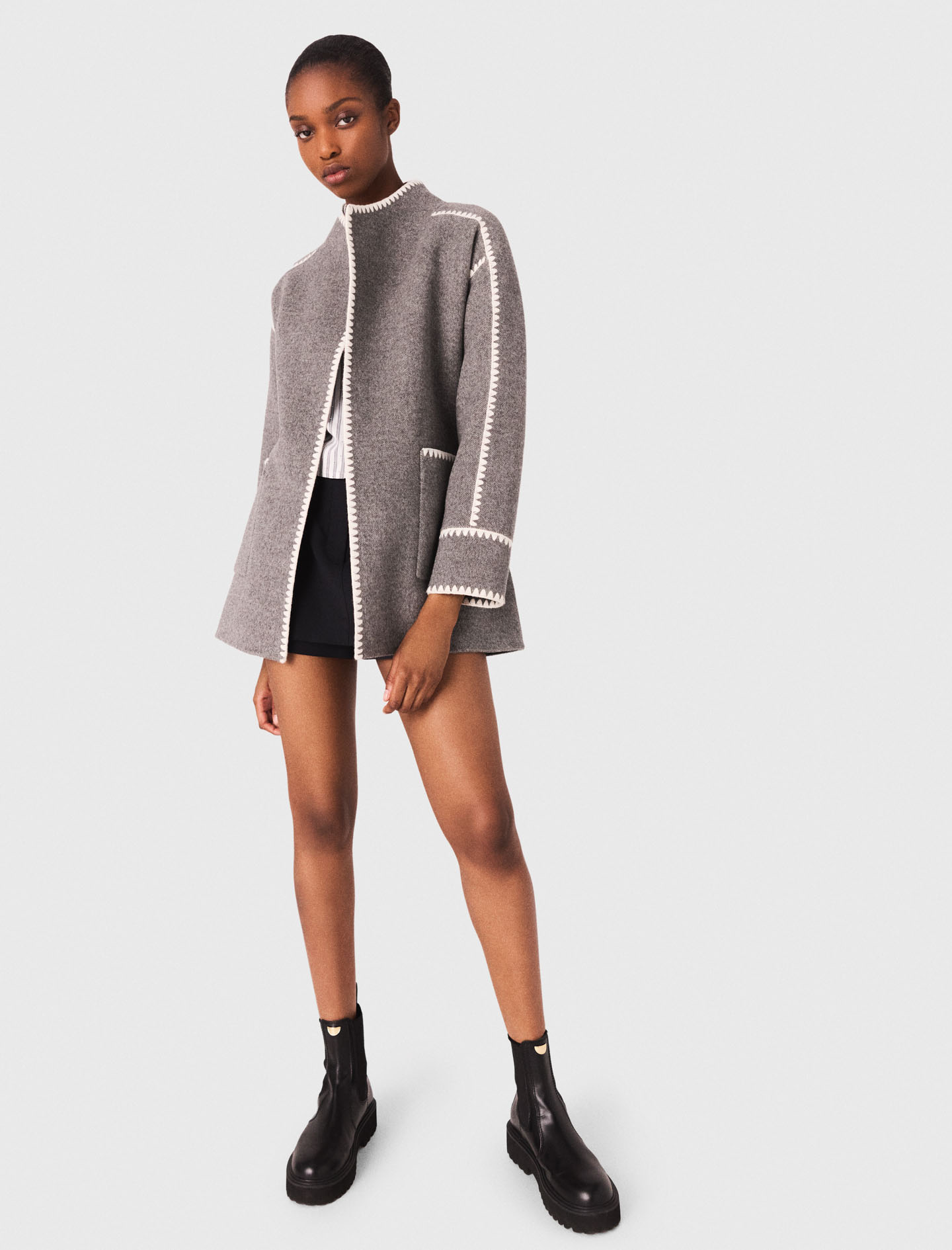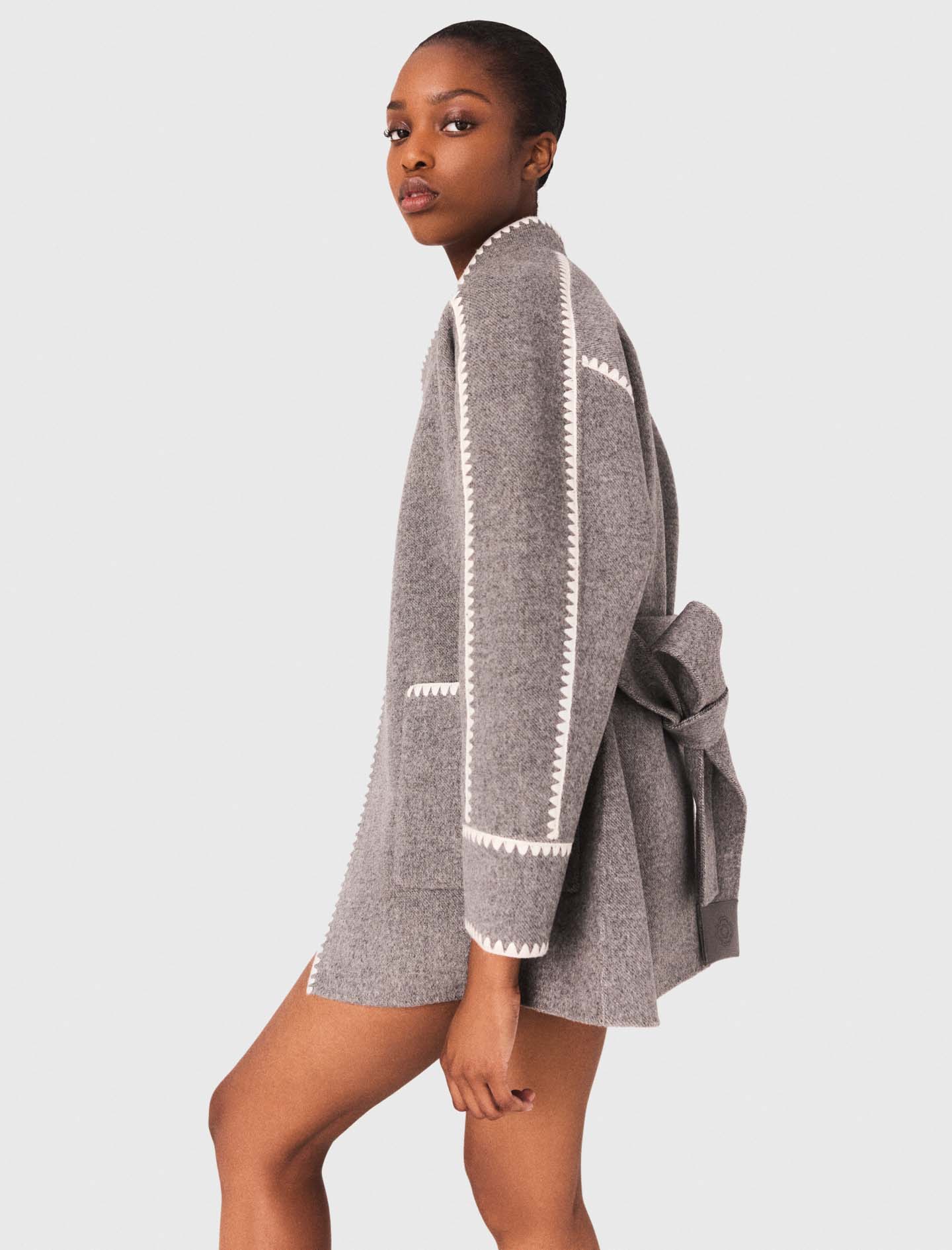 Maje wool Mid-length double-faced wool coat Contrasting embroidery Wide collar, long sleeves and removable belt Designed for a loose fit The season is settling in, and silhouettes are being crafted with more confidence.