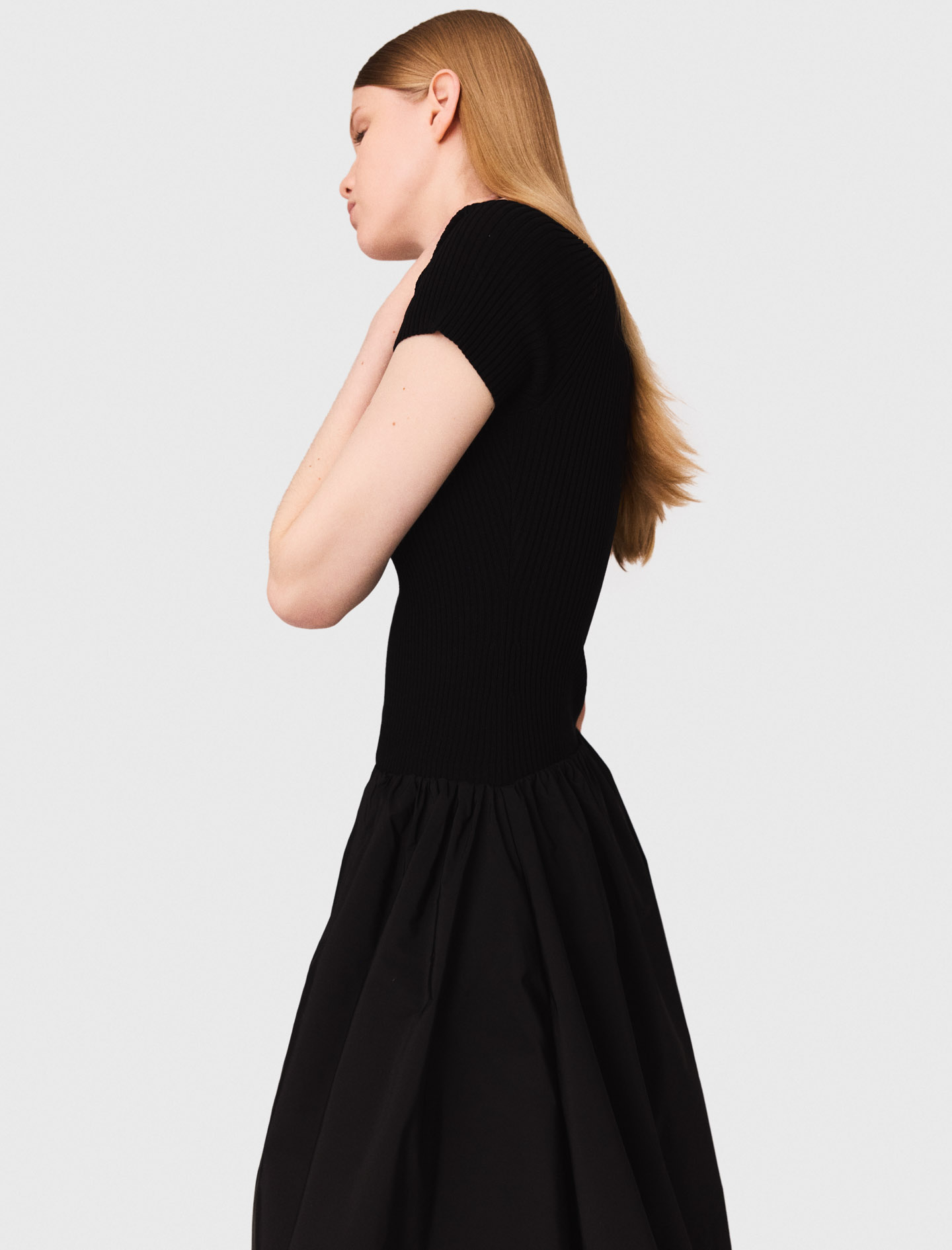 This long dual-material dress combines the comfort of ribbed knit with the lightness and volume of taffeta.