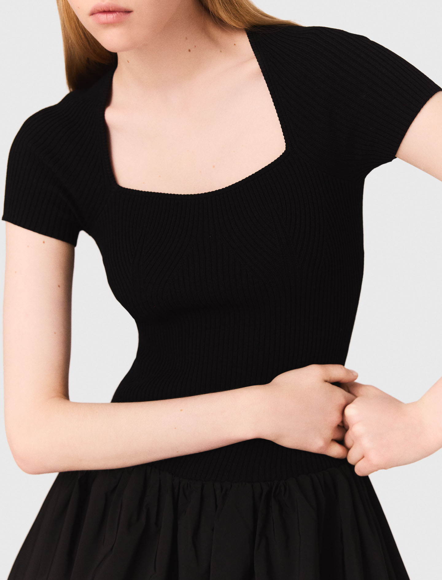 Maje viscose Long dual-material dress Ribbed knit top with round neckline and short sleeves Voluminous taffeta skirt with bubble effect Designed for a standard fit This season, Maje plays with materials and volumes to offer modern and elegant pieces, perfect for the new term.