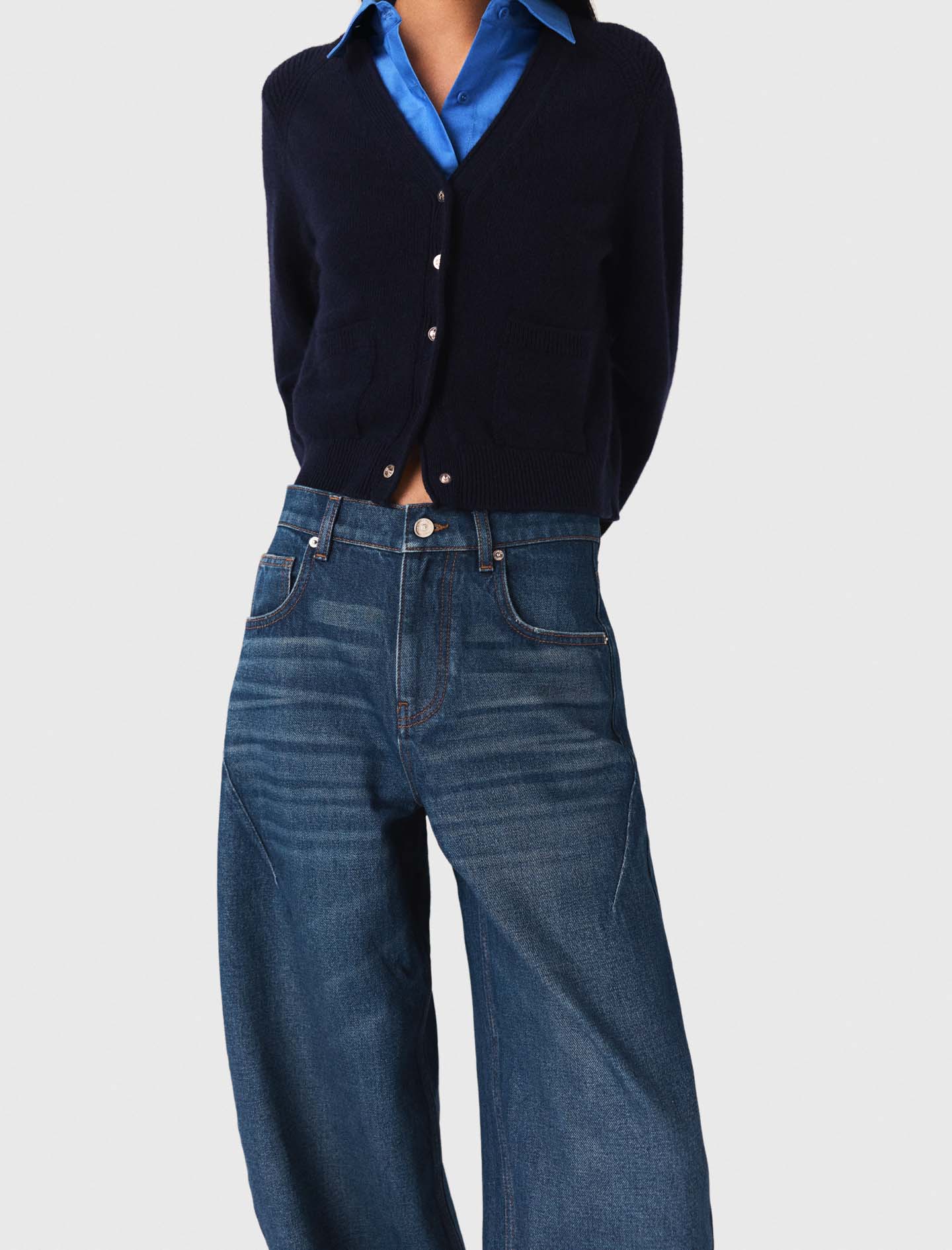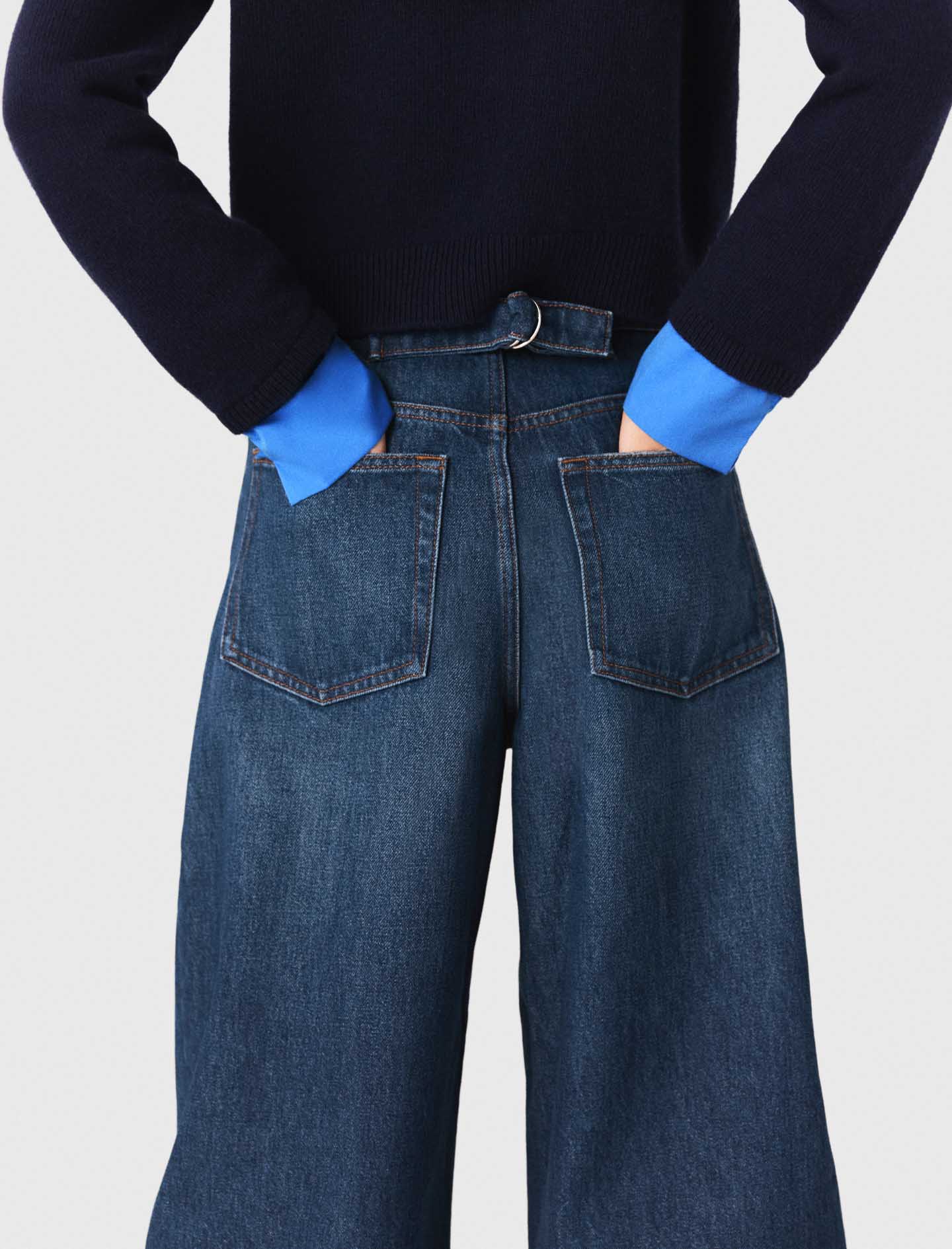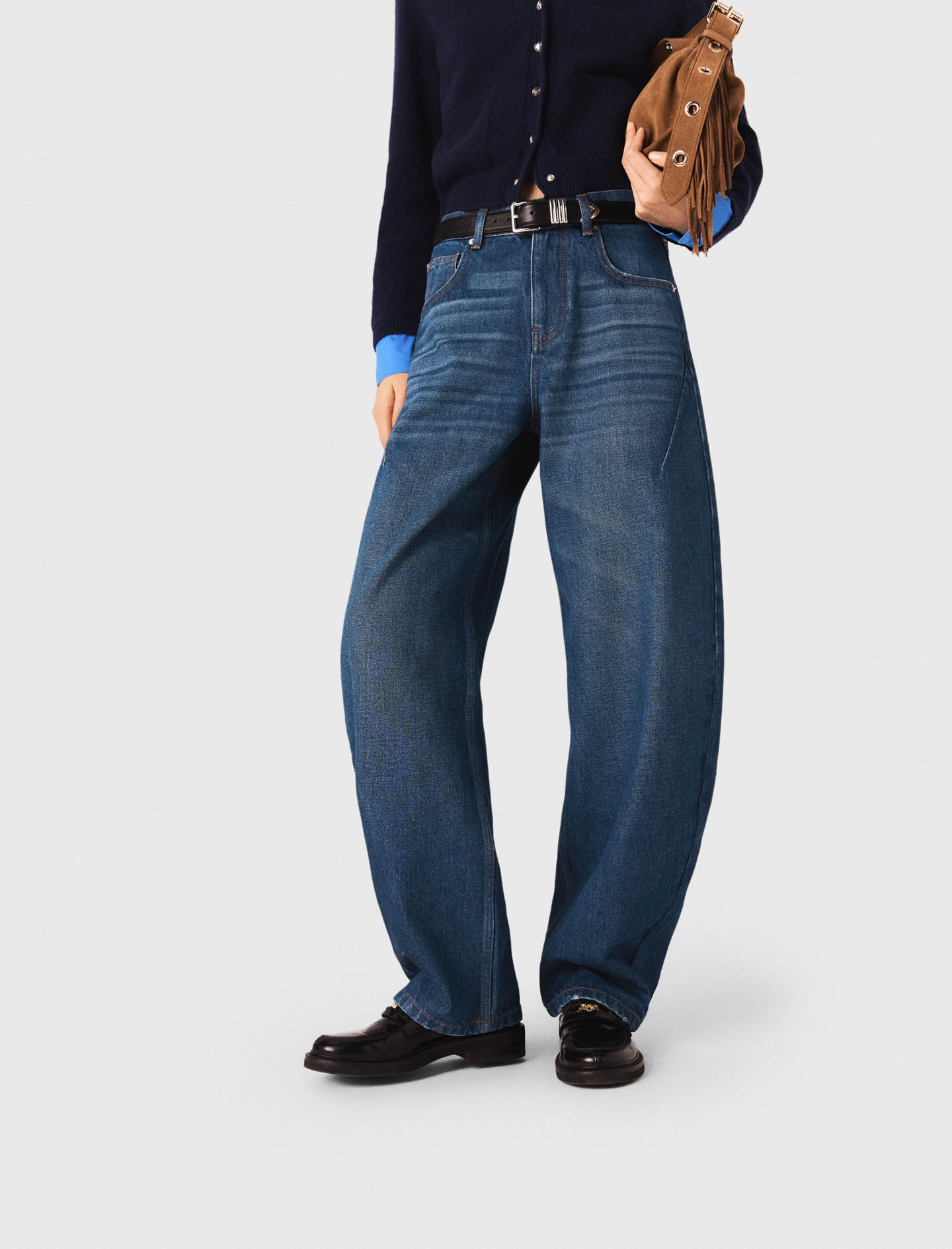 Maje cotton Wide-leg balloon-fit jeans Vintage wash and visible stitching Adjustable martingale on the back with metal buckle 5 classic pockets Designed for an boxy fit At the heart of a wardrobe designed to face the seasons with style, denim is a natural choice in this new Maje collection.
