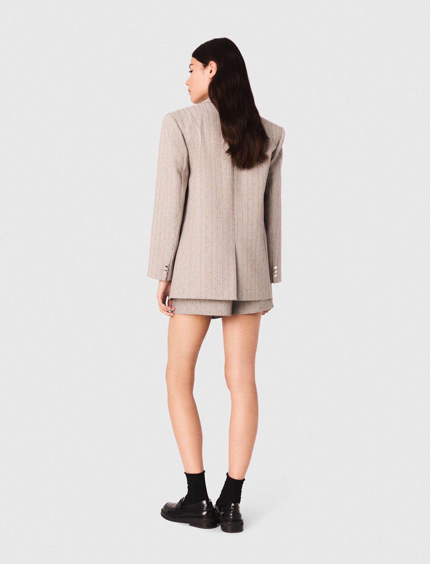 Maje polyester Suit jacket with rhinestone stripes Structured lapel collar with shoulder pads Engraved button fastening and back vent Designed for a boxy fit Designed as a luminous tailoring, the collection gives a twist to classic suits with sparkling details.