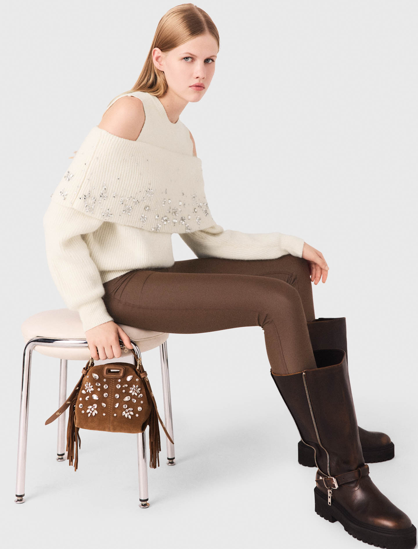 Maje wool Ribbed knit jumper Cutaway shoulders Rhinestone-embellished panel Round neck and long sleeves Designed for a loose fit This season is inspired by a warm wardrobe, enlivened by bright details that turn knitwear into precious pieces.