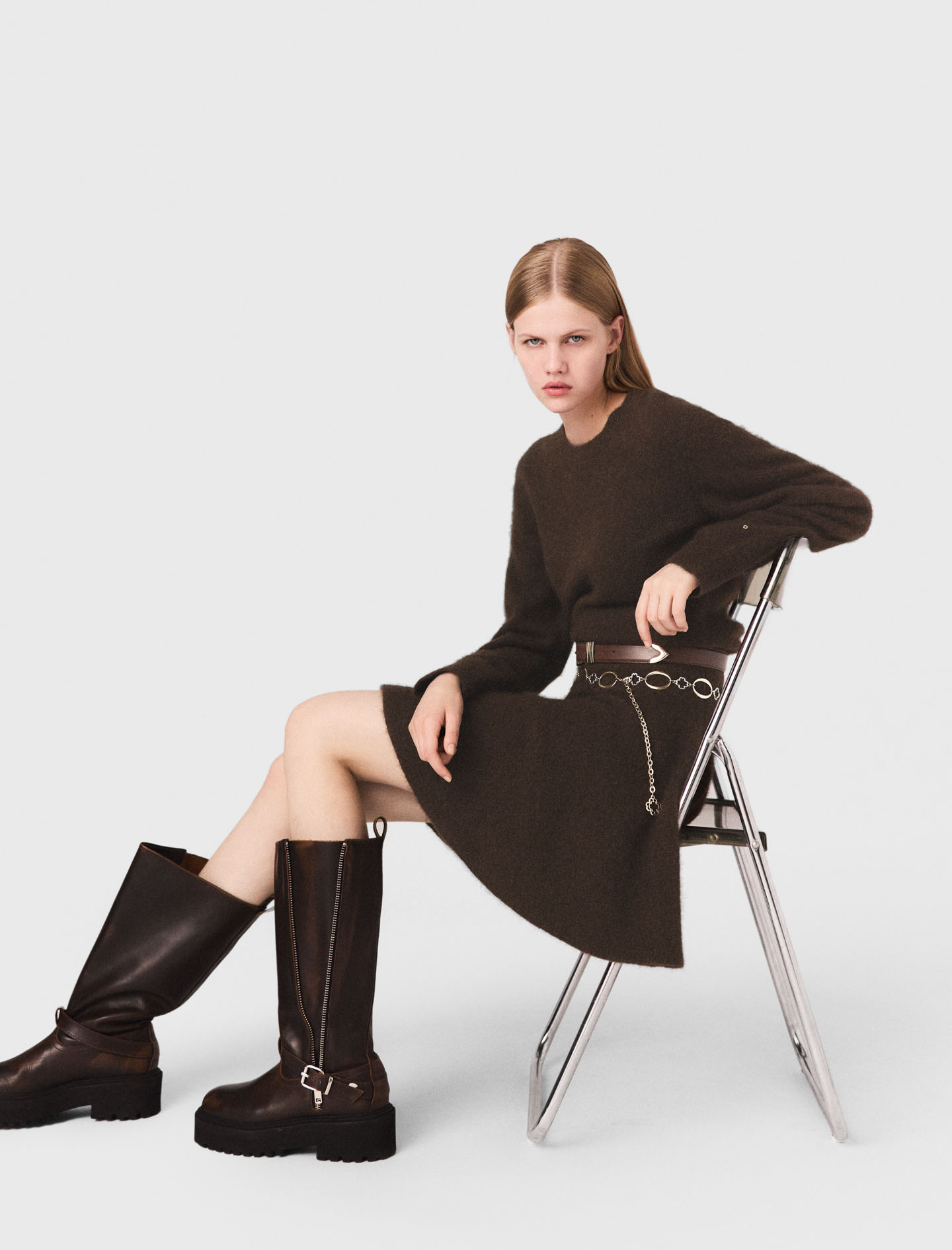 Maje yak Short yak knit dress Round neck and long sleeves Ribbed waist and flared skirt Designed for a standard fit The season highlights cosy pieces where the softness of the fabrics meets feminine tailoring.