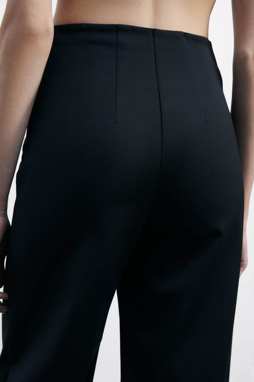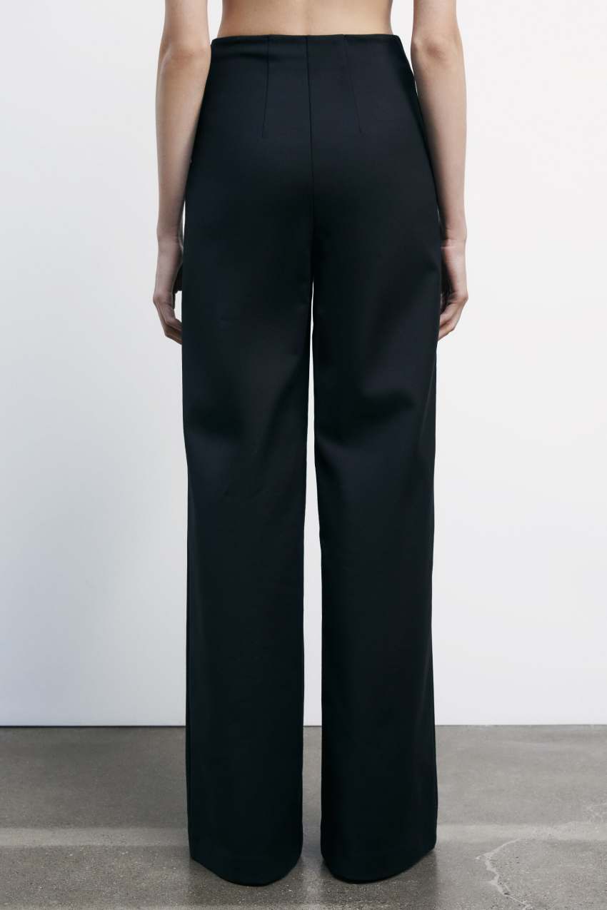 accompagnata da gamba a palazzo con pieghe stirate.