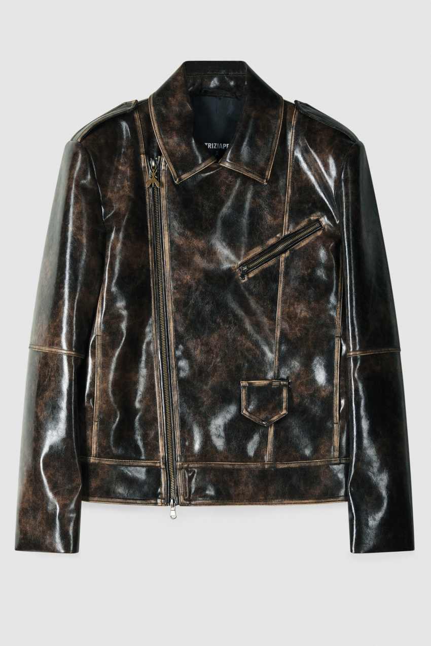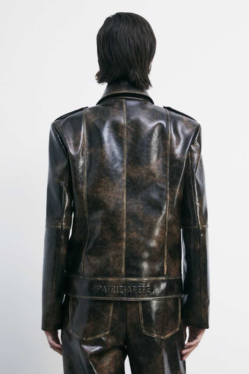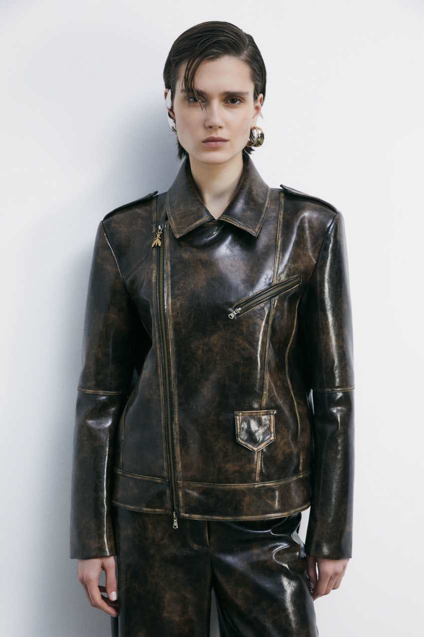Il DNA Patrizia Pepe si riassume nel giubbotto chiodo over realizzato in tessuto spalmato spazzolato per un effetto "used" dalle sfumature calde e fondenti.