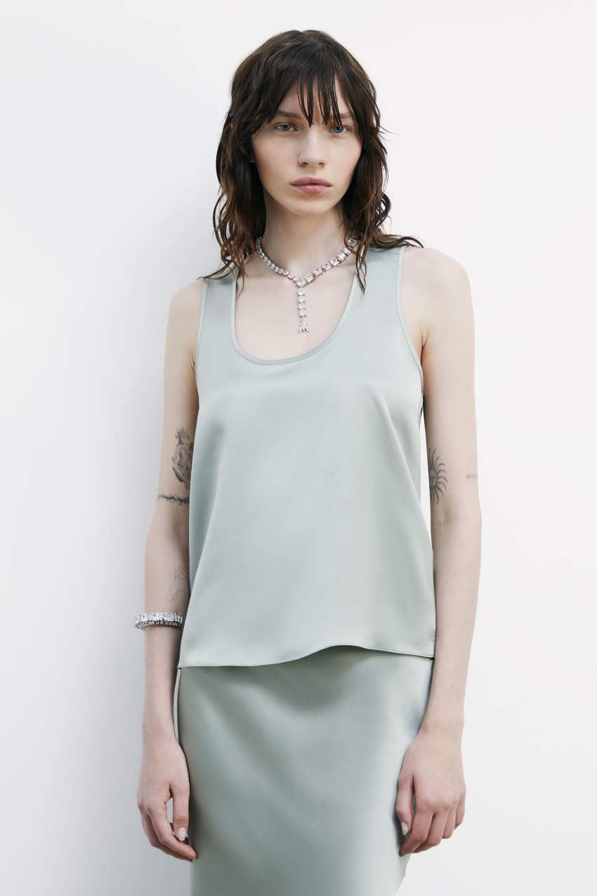 Il design essenziale del top si fonde con la sofisticatezza del raso in questo capo minimal ed elegante.