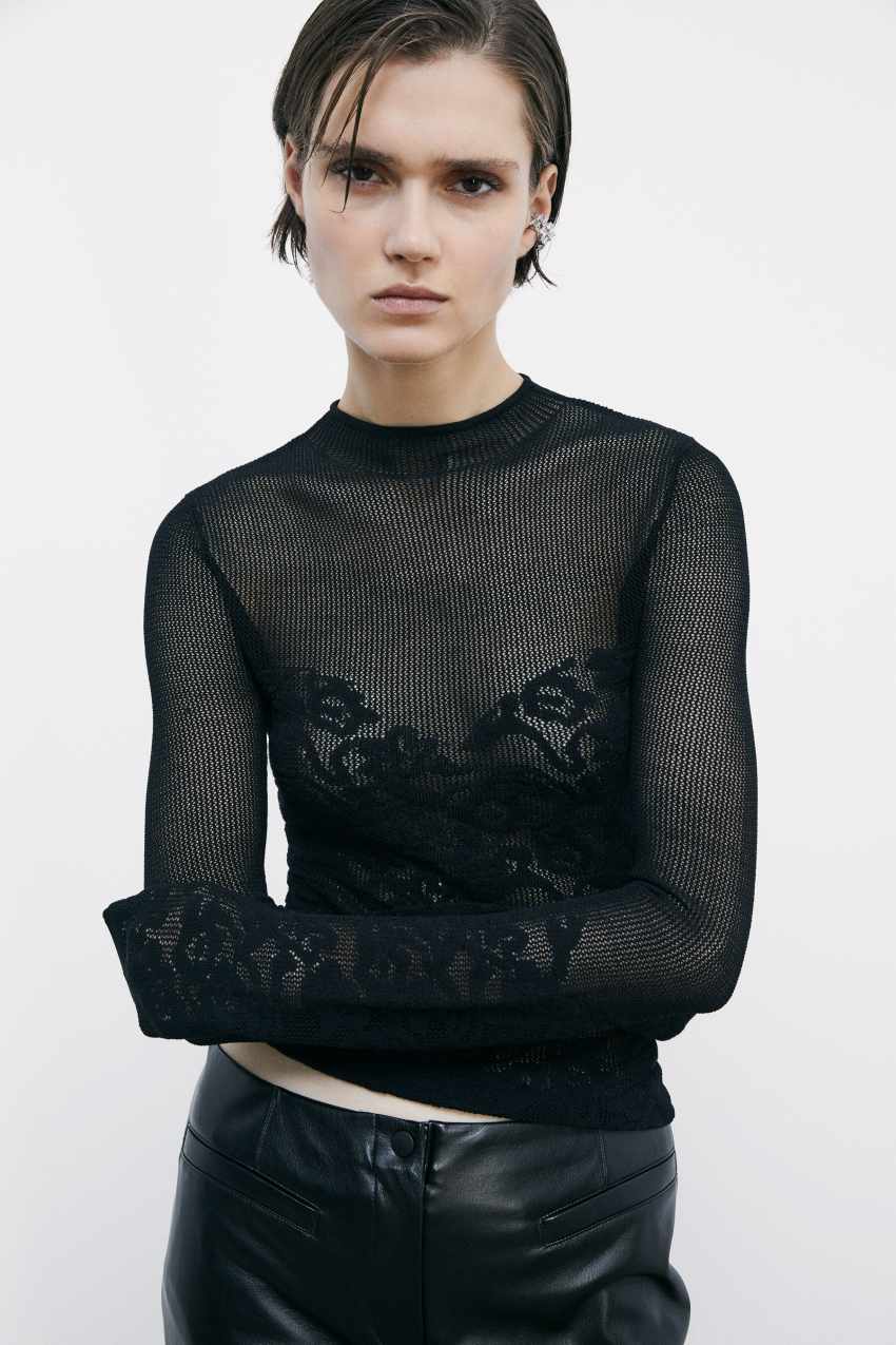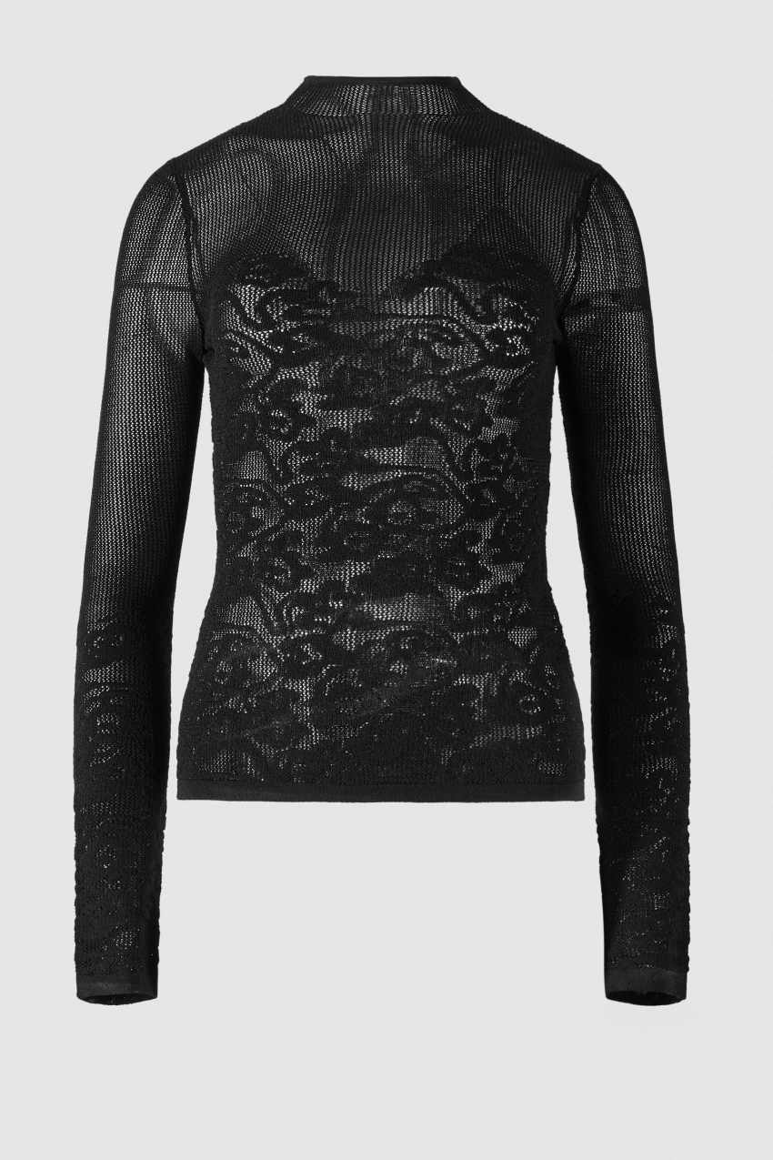 Dolcevita realizzato in maglia con collo a cratere a taglio vivo e lavorazione effetto pizzo per un sofisticato stile see-through.