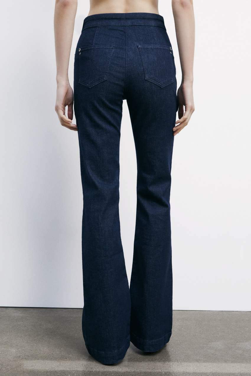 questi jeans flare sono valorizzati da un dettaglio effetto cintura in vita.