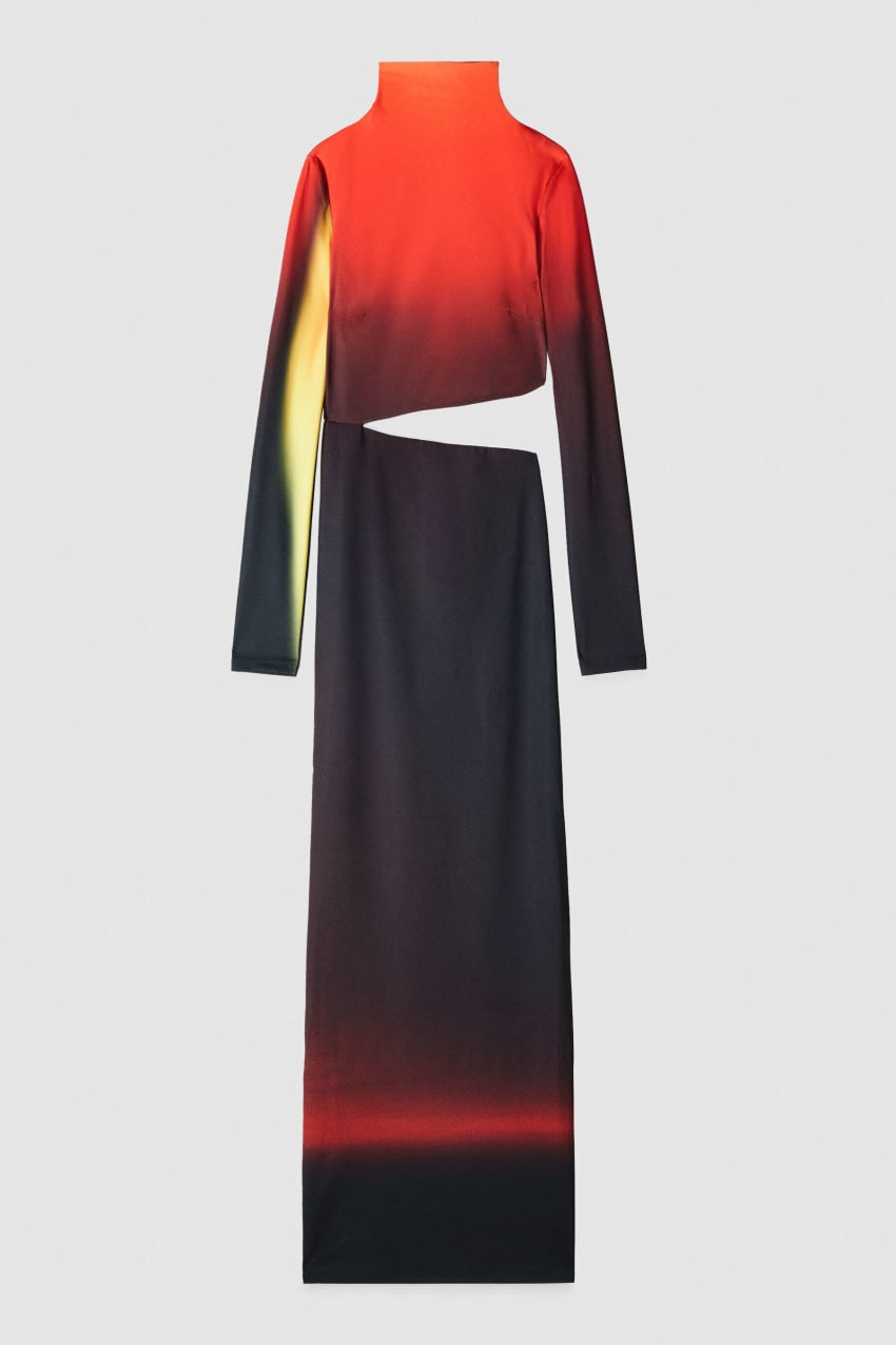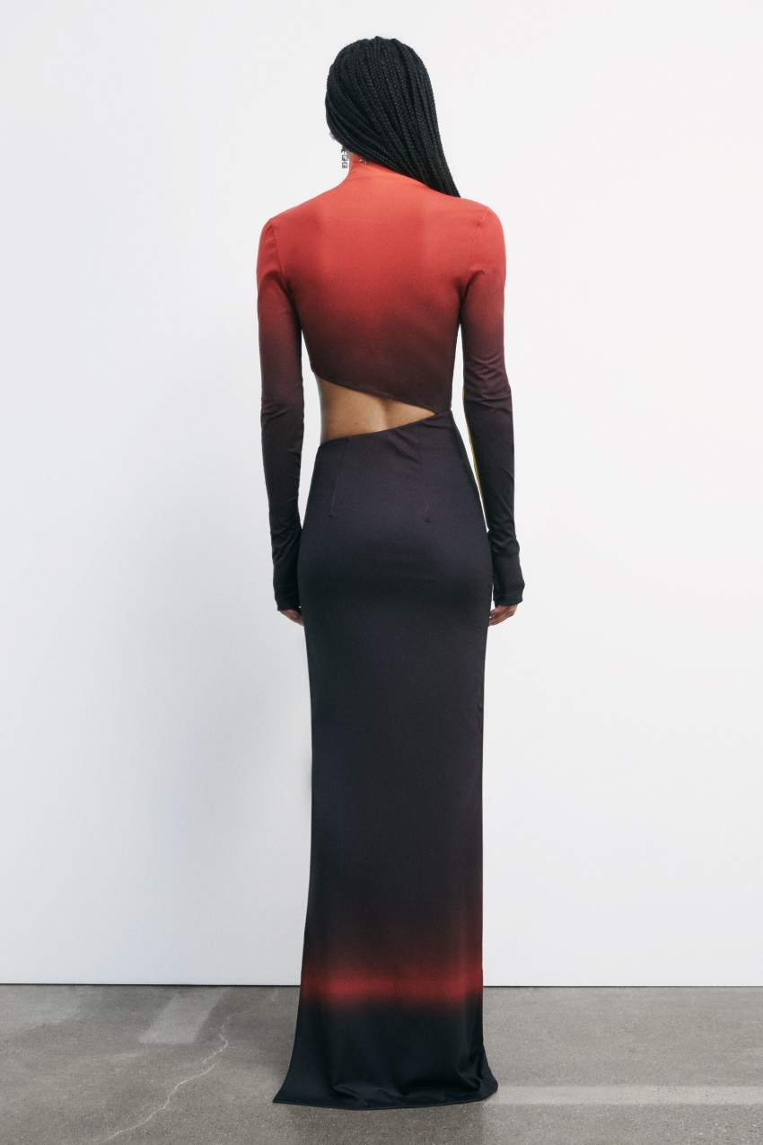 l'abito lungo in jersey tecnico elasticizzato scolpisce una silhouette sensuale e audace.