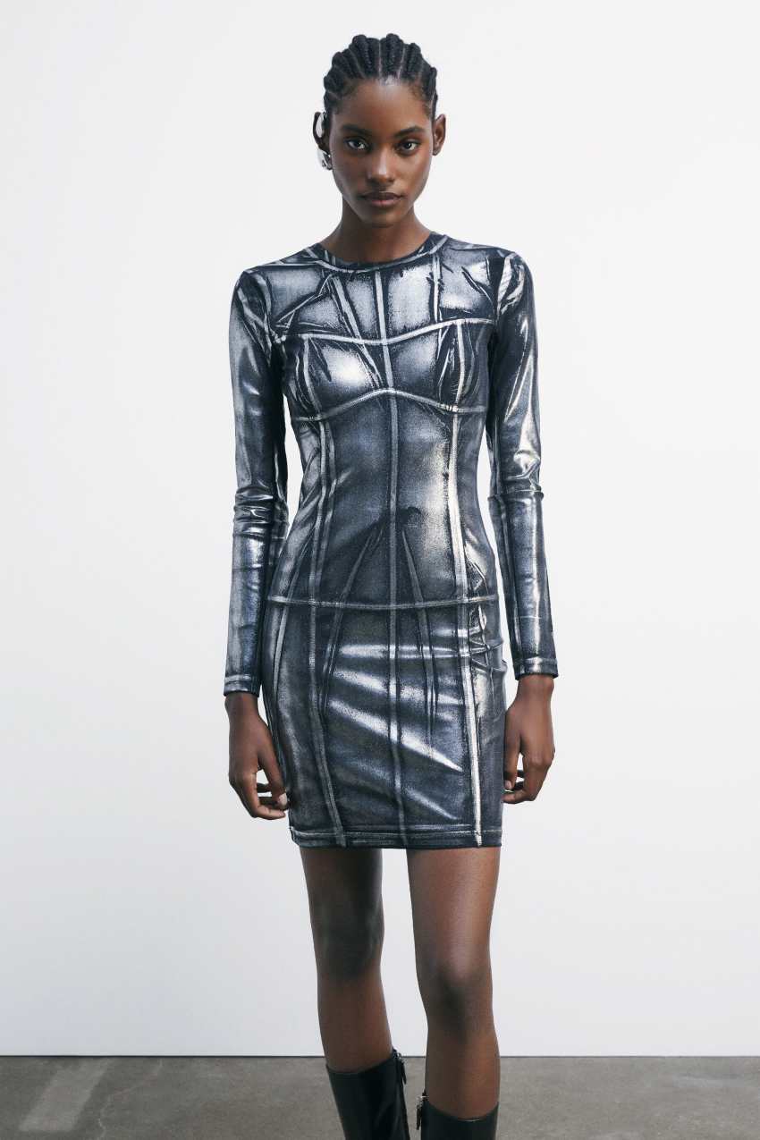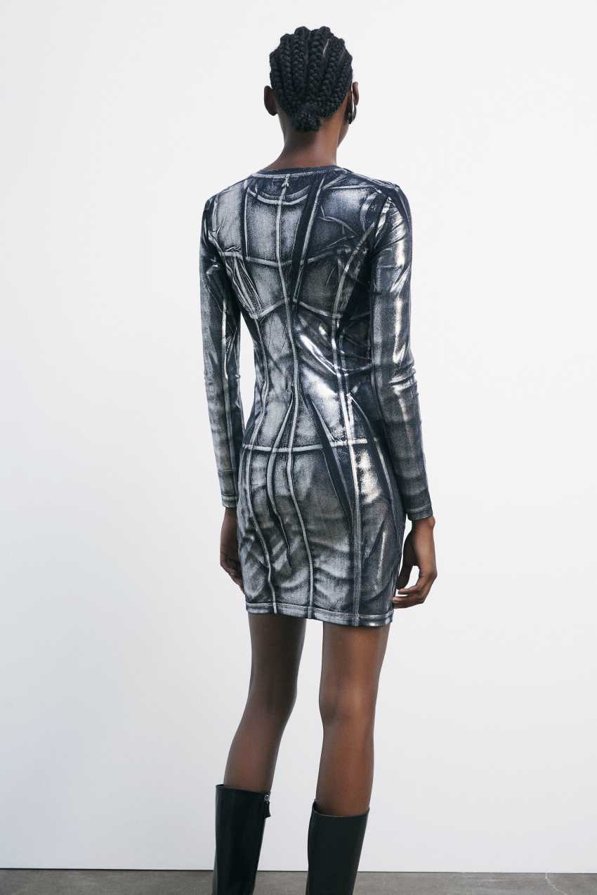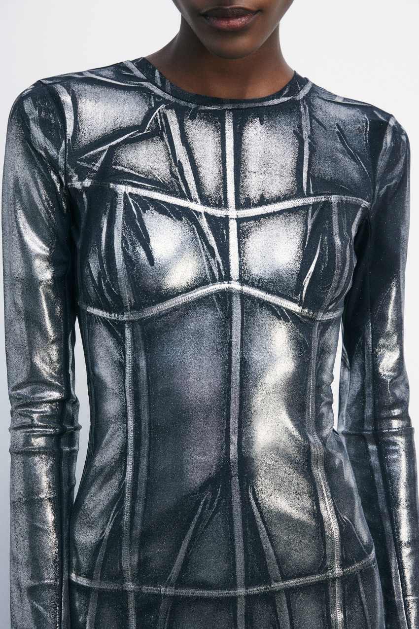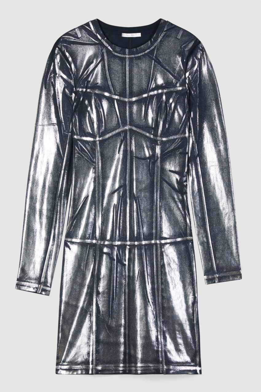 Mini abito aderente in jersey tecnico elasticizzato con effetto metallizzato.