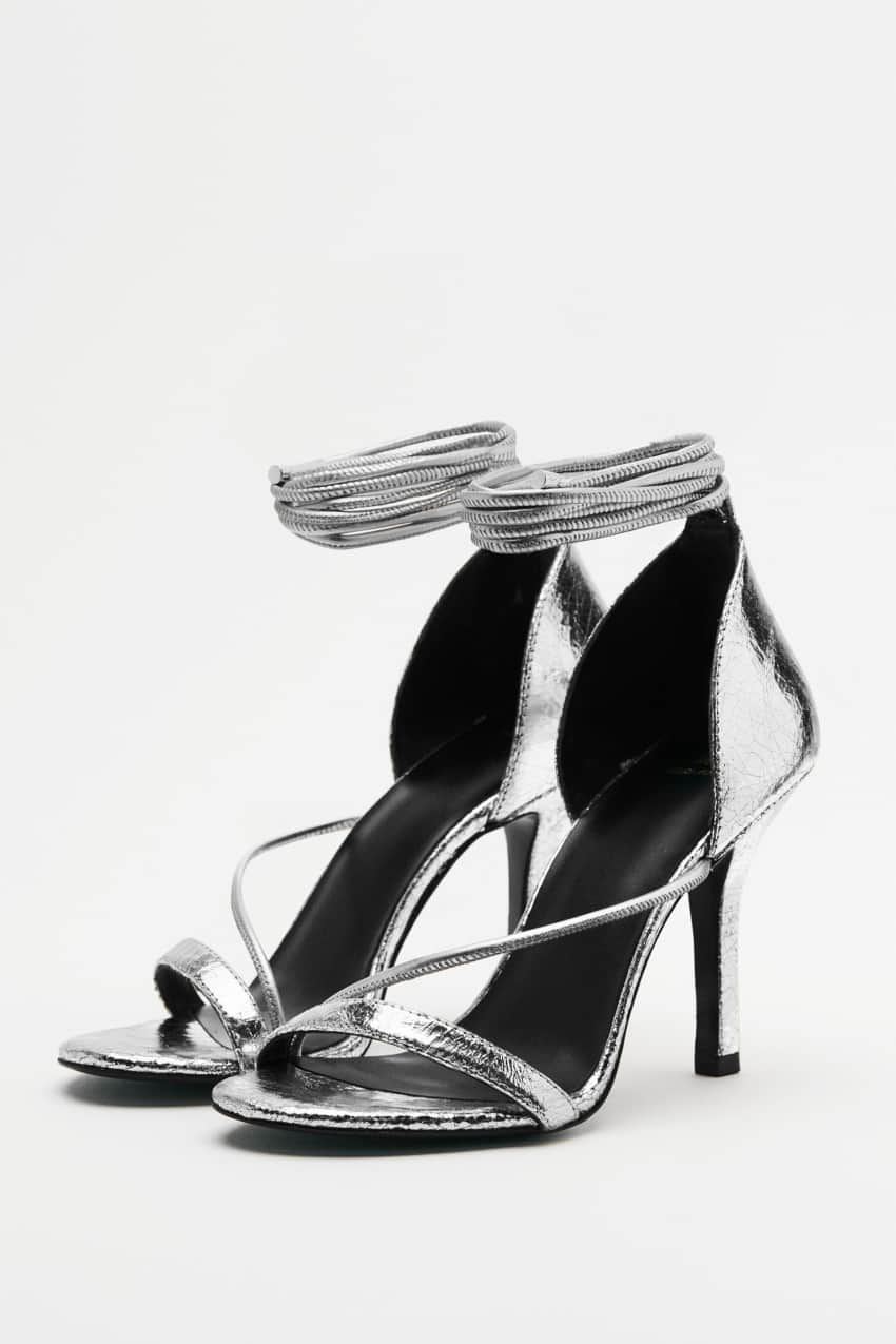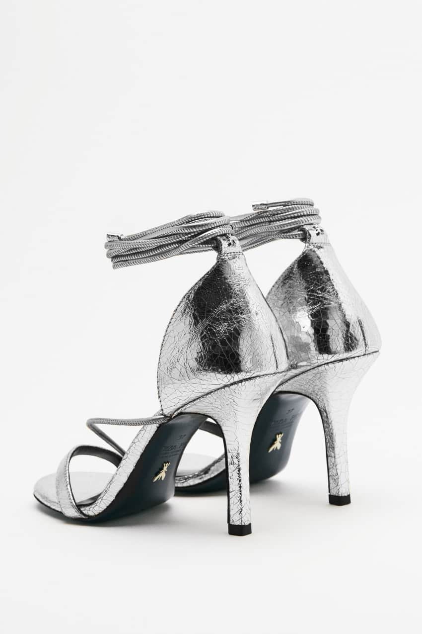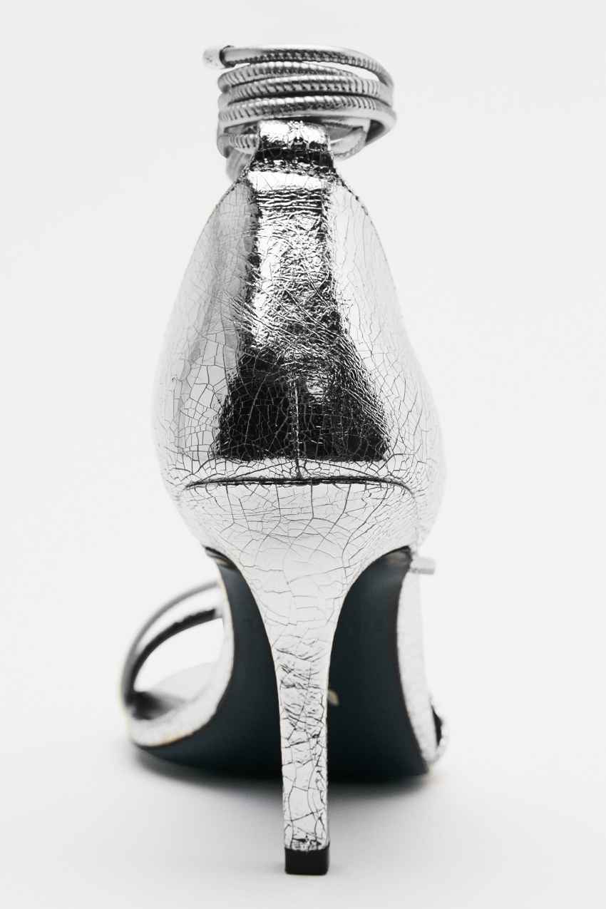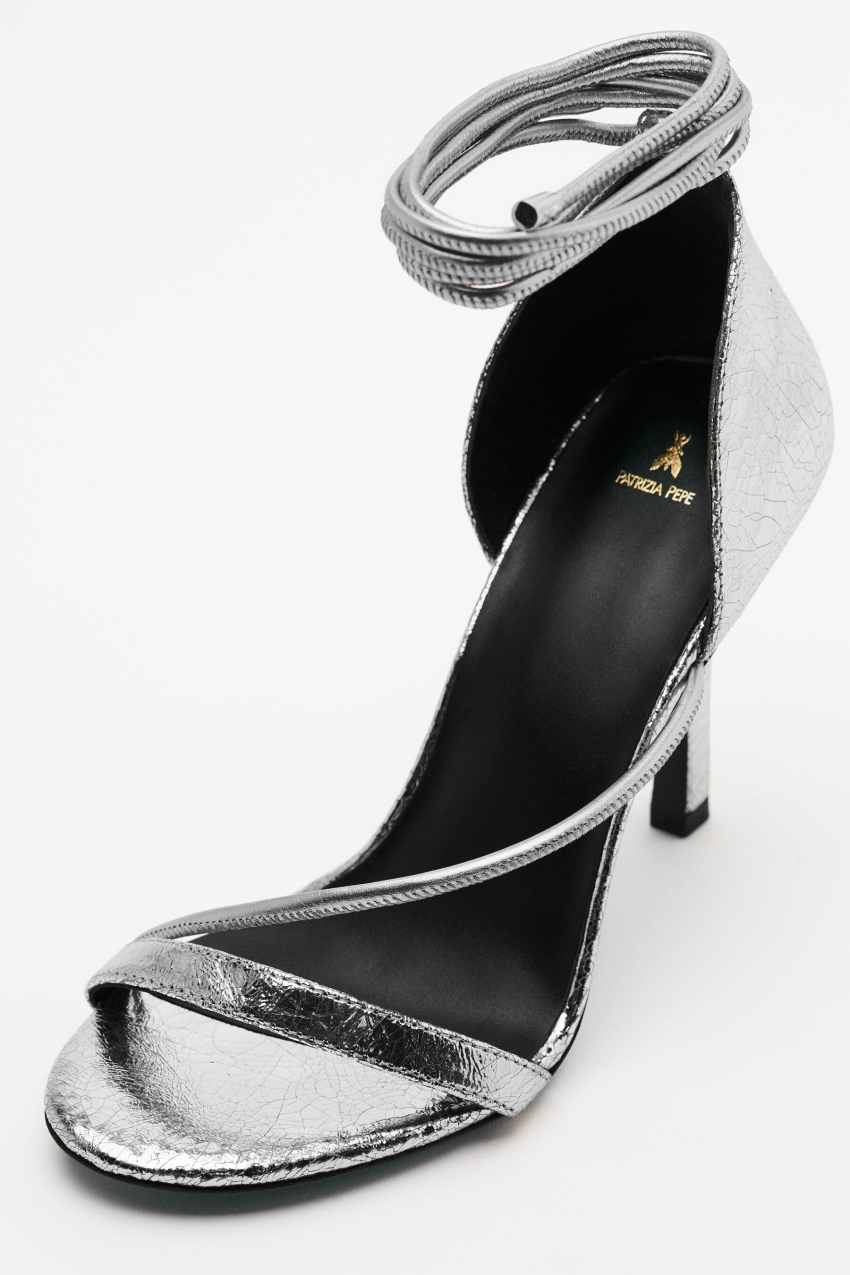 Sandali con tacco realizzati in pelle laminata con effetto craquelé.