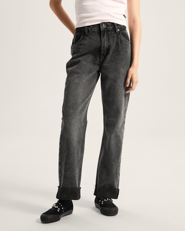 Opgerolde boorden met een onafgewerkte zoom creëren een versleten look, terwijl een veterriem subtiel verwijst naar onze wortels in de skatecultuur