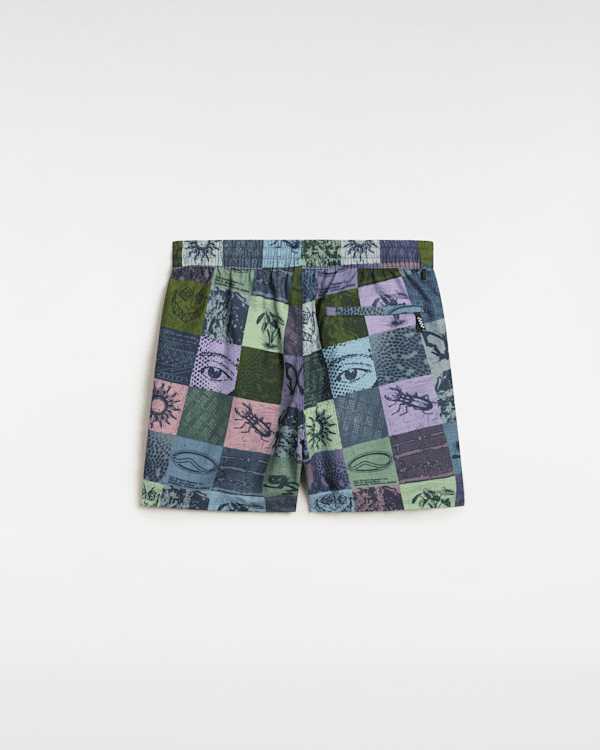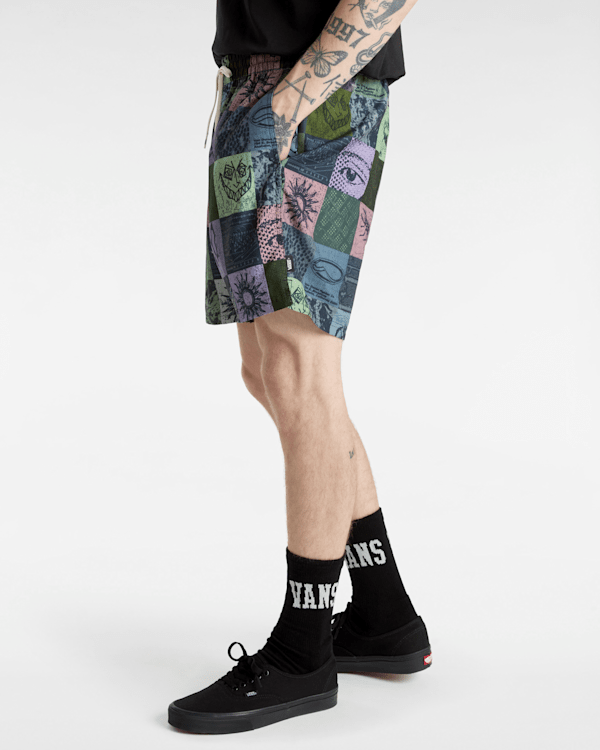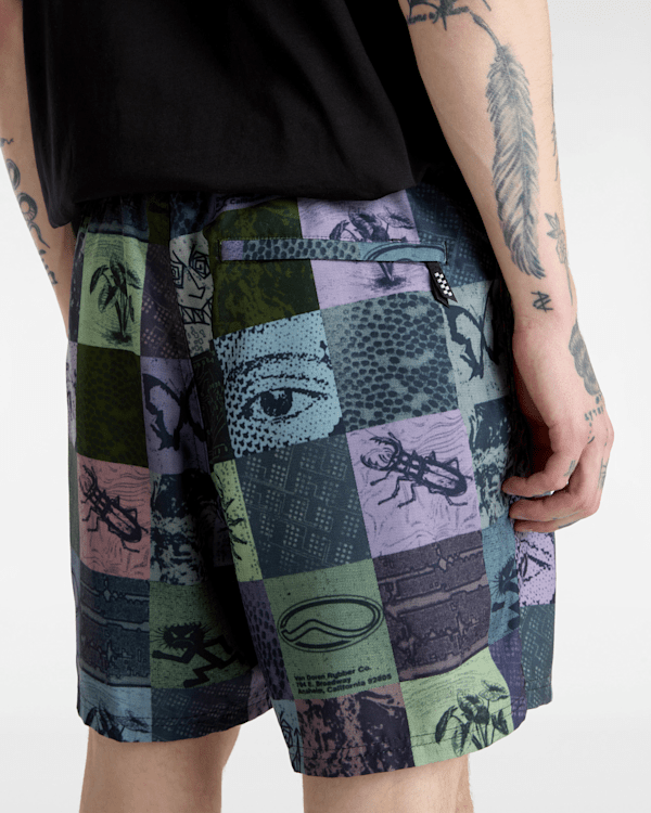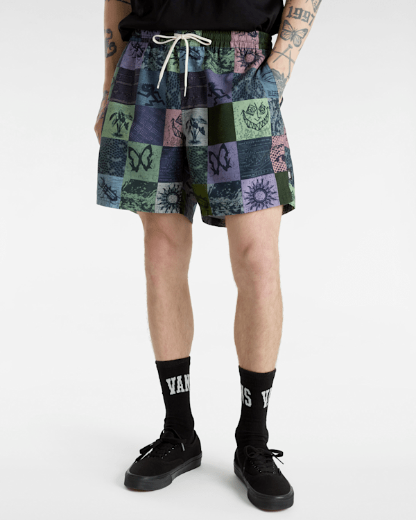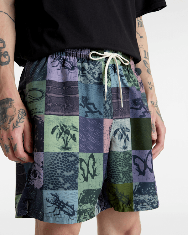 This water resistant short has an elastic waist with drawcord which allows for all day comfort in and out of the water and features side seam pockets, an eye-catching illustrated checkerboard design, and a keyloop for security.