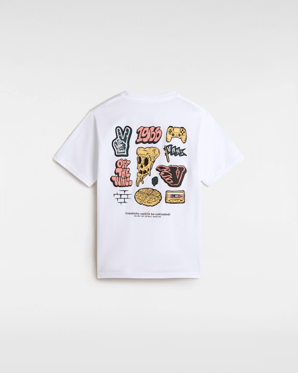 The Kids Essentials T-Shirt is a short sleeve crew neck T-shirt made from a heavier weight cotton featuring a screenprinted flaming V graphic on the chest, and a complementary collage of graphics on the back.