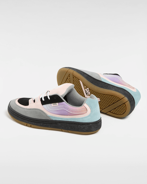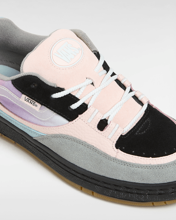 Obscure archive 90s skate shoes Suede, canvas and synthetic uppers Layering of panels with toe cap and mudguard Modernised mid-90s cupsole Molded tongue branding