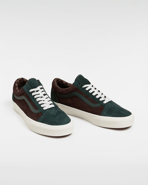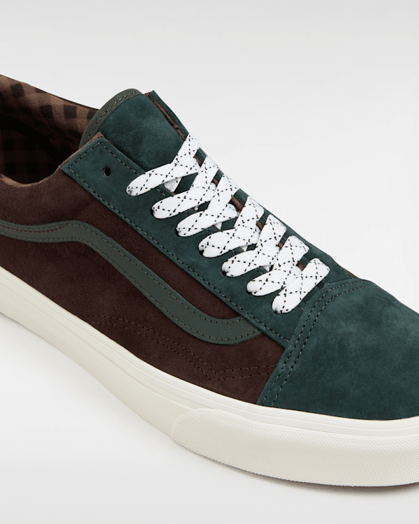 Iconic low-top, Sidestripe™ shoe Pig suede uppers with plaid textile linings Lace-up closure Reinforced toe caps Supportive padded collars Signature rubber waffle outsoles Classic Old Skool™