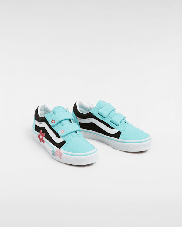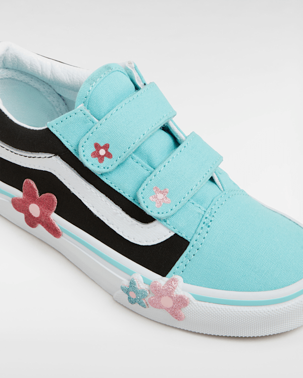 Strap Closures Create a Kid-Friendly Fit on this Iconic Sidestripe Shoe The Kids Old Skool V Glitter reimagines our iconic Sidestripe shoe by swapping traditional laces for double hook-and-loop closures.