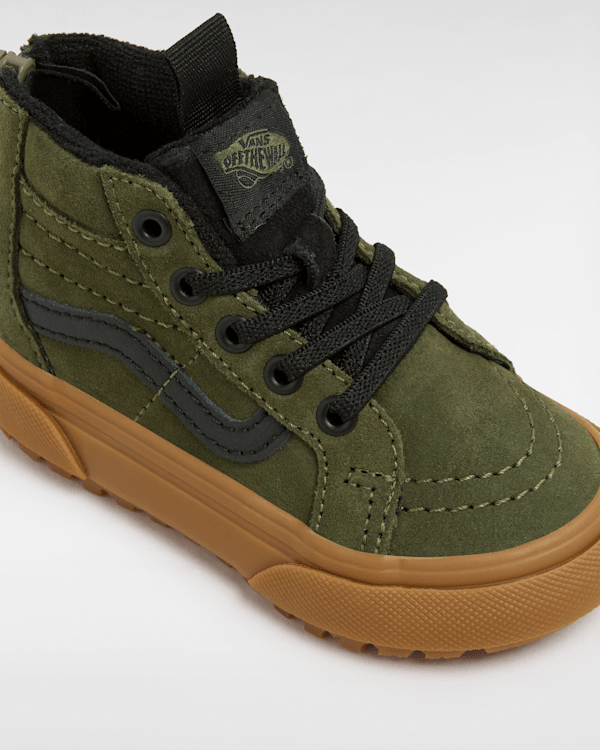 The Sk8-Hi is an all-time Vans classic, but the Toddlers MTE Sk8-Hi Zip is built for adventure with a water-resistant suede upper, a Primaloft insulation package, and an outsole designed for increased traction.