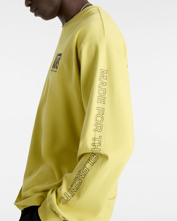 100% Organic cotton fabric Long sleeve jersey T-shirt Ribbed neckband and cuffs Pigment overdye wash Screenprinted graphics on the chest, sleeves and back Unisex sizing Loose fit