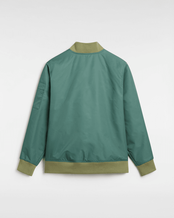 100% Nylon fabric Satin bomber jacket with quilted lining and heavy fill Ribbing at collar, cuff and hem Zip closure Front hand pockets with flap and hidden snap closure Sleeve pocket detail with zip entry Woven label on left hem