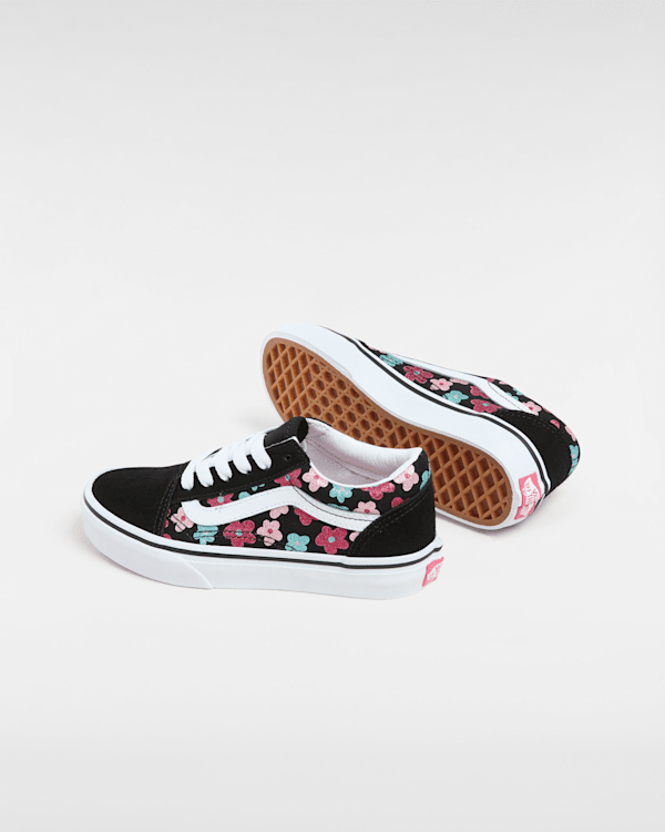 Iconic low-top, Sidestripe™ shoe made for kids Suede and canvas uppers with glitter flowers Lace-up closure Reinforced toe caps Supportive padded collars Signature rubber waffle outsoles Classic Old Skool™