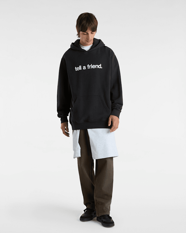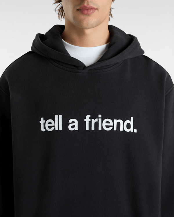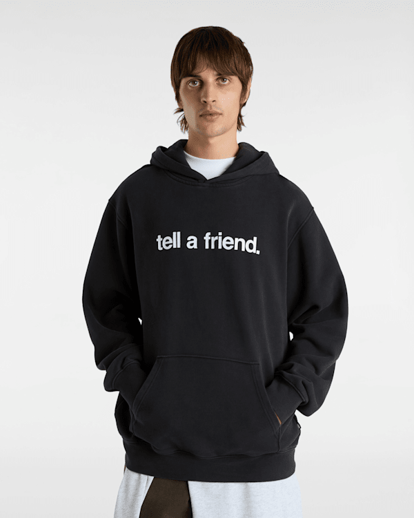 The Tell a Friend Crew Pullover Hoodie has long sleeves, a front pouch pocket and logo graphics on the front.