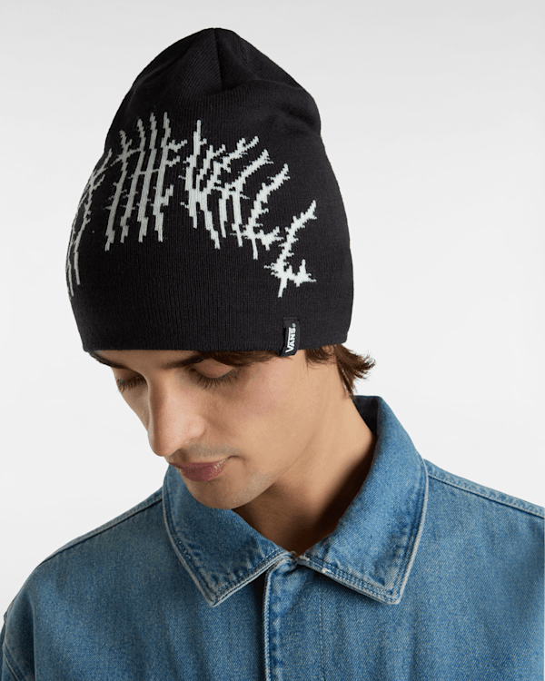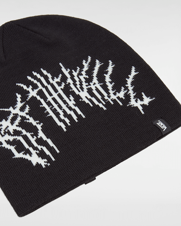 The Metal Blaze Beanie is a jacquard beanie with Off the Wall graphics and the Vans clamp label on the front.