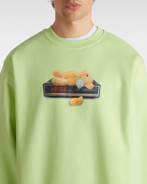 The Times Up Crew Sweatshirt has a crew neck, long sleeves and a clock radio and teddy bear on the front.