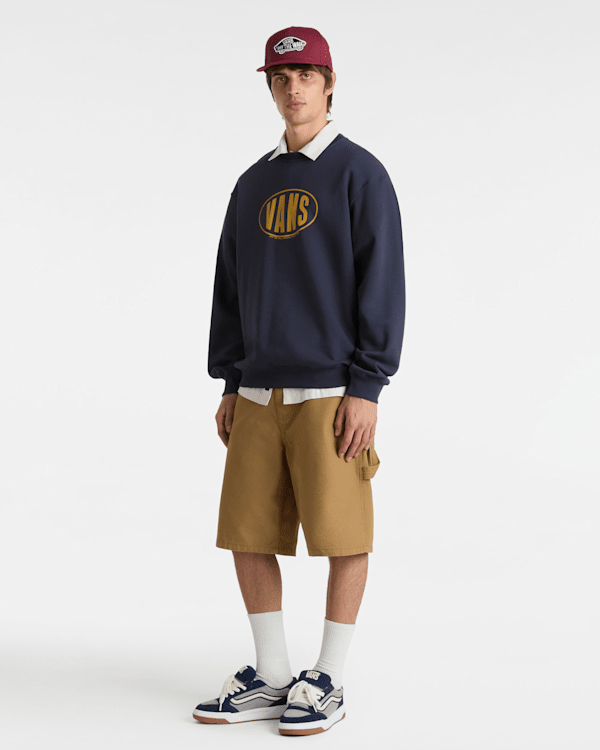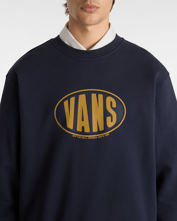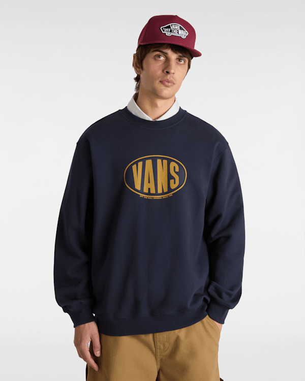 Loose fit, brushed interior The Spray On Loose Crew Sweatshirt is a looser fit crewneck sweatshirt made with a comfortable cotton-blend fleece, featuring a bold screenprinted graphic of the Vans® logo on the chest.