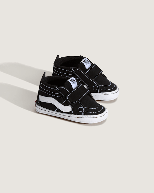 Everyday wear, original Icon The Vans Sk8-Hi Crib, redesigned for a perfect fit in the style of the original Sk8-Hi, features sturdy canvas and suede uppers, a hook-and-loop closure, and heel pulls for an easy on-and-off fit.