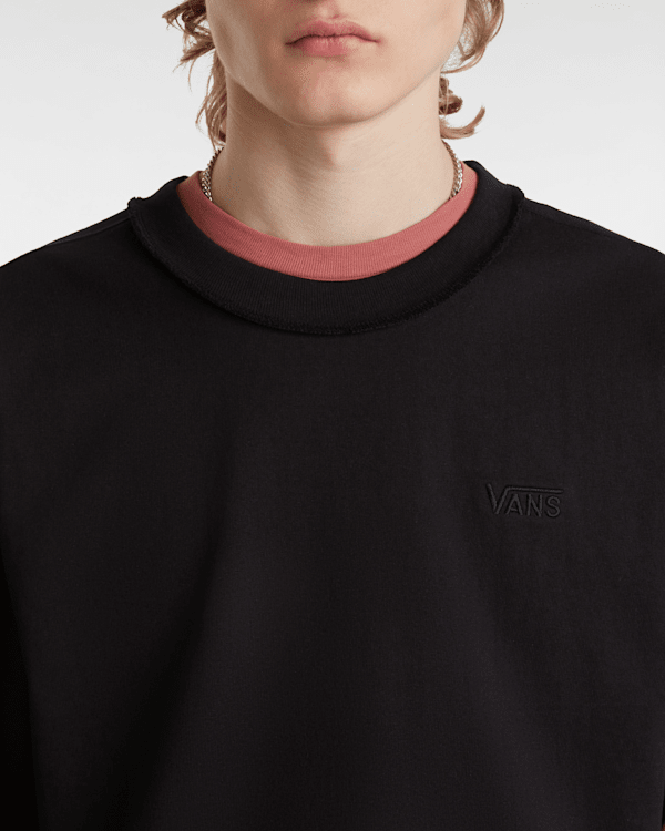 The Vans logo print is at the chest and there is an interior woven label and an exterior woven flag label at the side seam