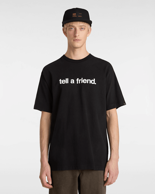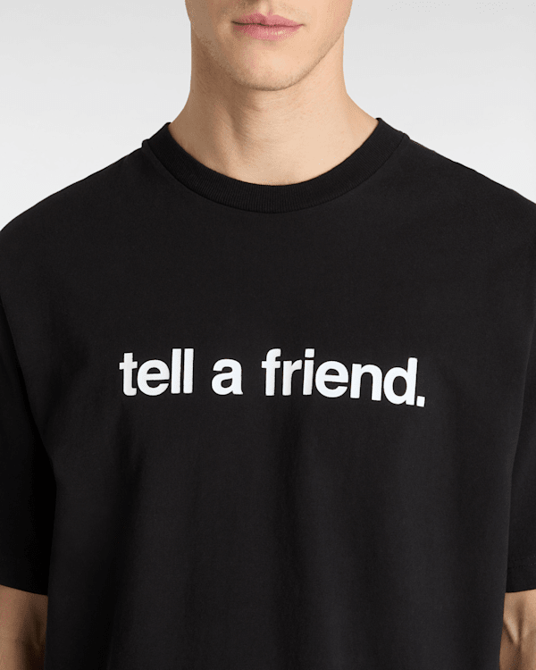 The Tell a Friend T-Shirt has a crew neck, short sleeves and logo graphics across the front.