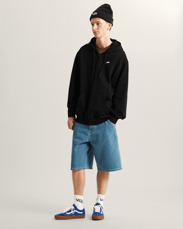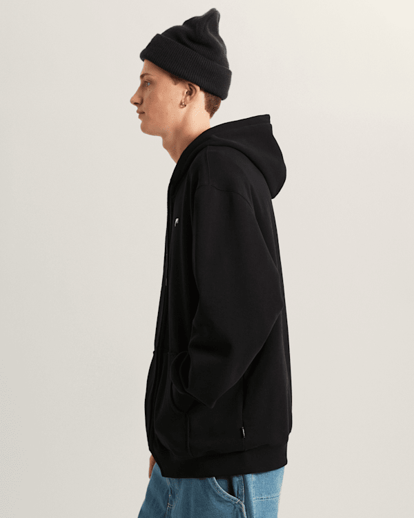 It features a front zip for ease of wear, front pockets, and an embroidered skateboard logo on the left chest, a subtle nod to the skating heritage that has defined our history as a brand