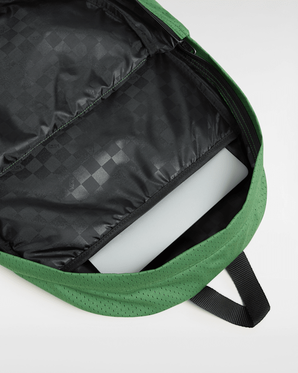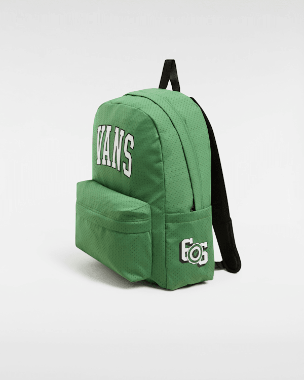 This design features varsity-style Vans logos on the front and side pocket.
