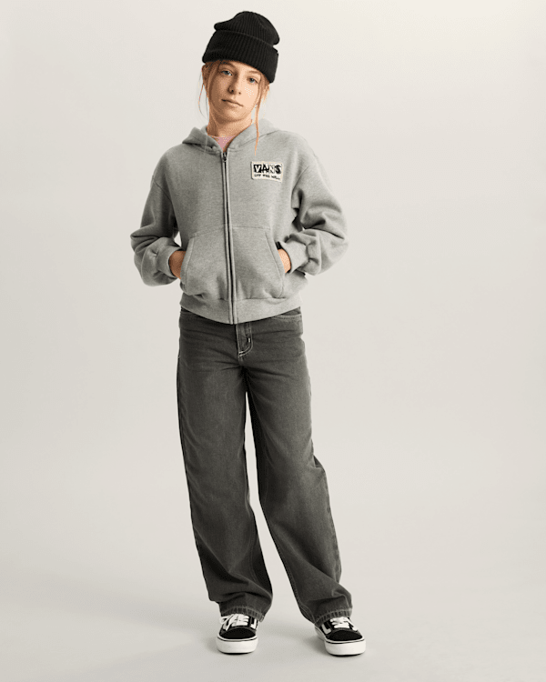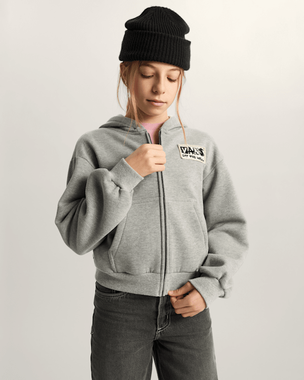 The Kids Van-Archy Label Zip Hoodie takes on the punk sensibilities of the mid-70s with a high-def woven graphic of the Vans logo.