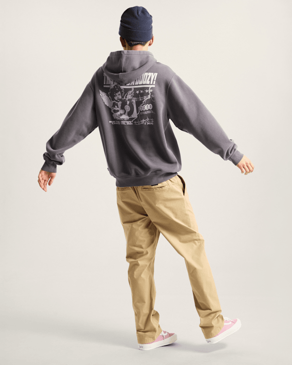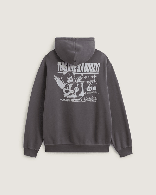 Wrap up and tune in to some classic vintage vibes with the Earthbound Pullover Hoodie, a hooded sweatshirt with XL vintage record label-inspired graphics on the back and a reworked Vans logo on the left chest.