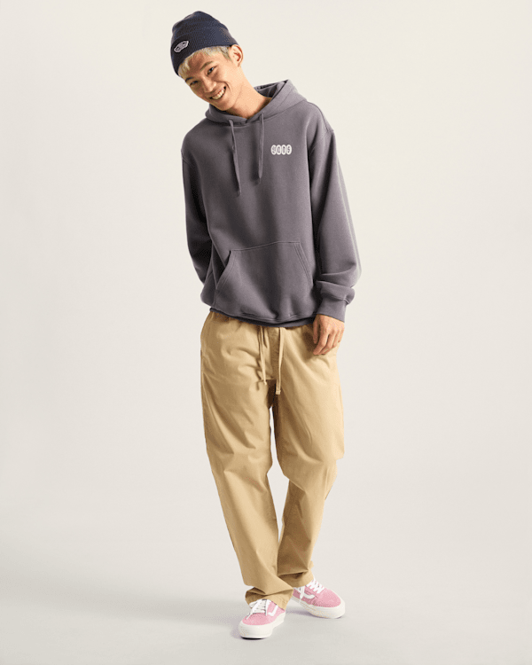 The hoodie features a kanga-style front pocket and offers a loose fit for a more laidback, slouchy feel