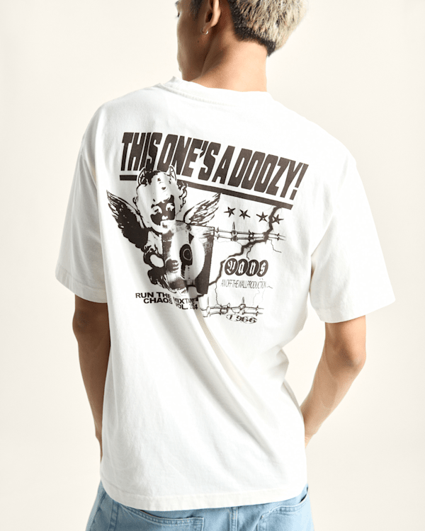 It features the Vans logo with angel imagery on the back and has a loose fit