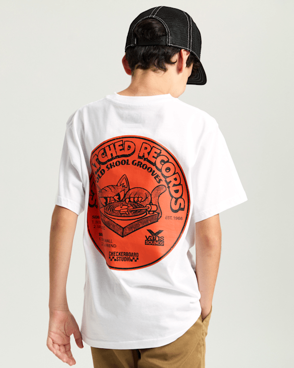 Add another hit to their collection with the Kids Scratched Records T-Shirt, a graphic tee with XL vinyl-inspired graphics on the back and reworked Vans logo art on the left chest.