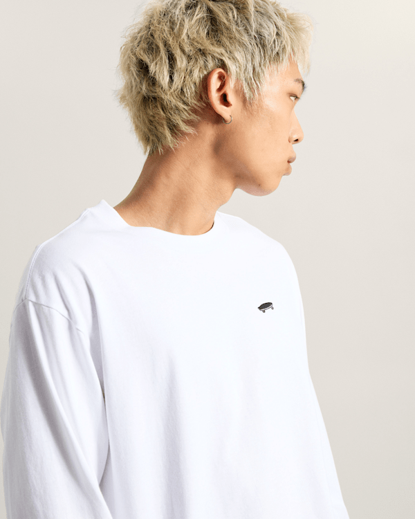 The design features a crew neck, long sleeves with ribbed cuffs, a ribbed neckline, and an embroidered skateboard logo on the left chest, a subtle nod to the skating heritage that has defined our history as a brand
