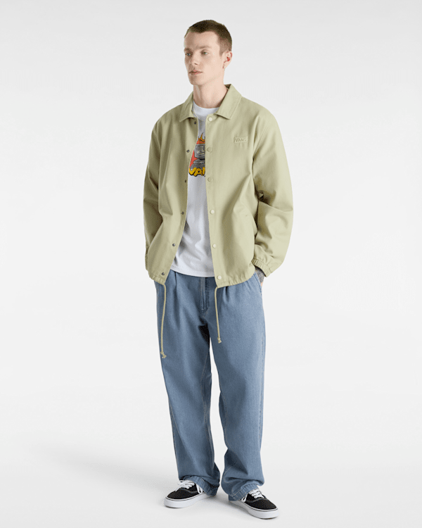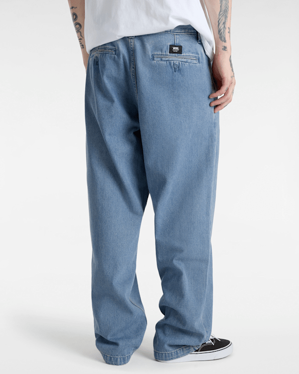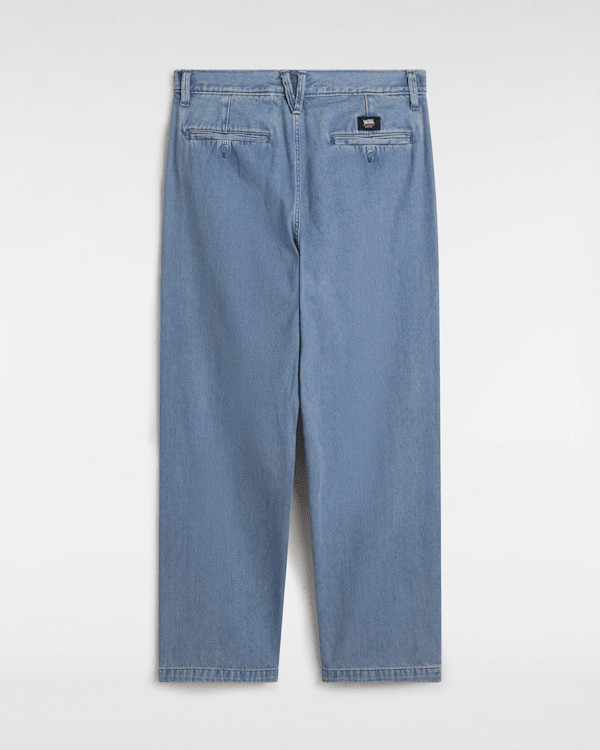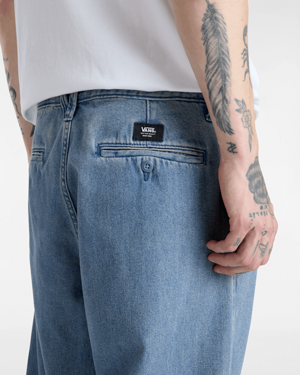 100% Baumwoll-Denimstoff Klassische Chinohose Vordertaschen mit Münzfach Paspeltaschen hinten mit Knopfverschluss Aufgestickte „Drop-V“-Riegelnähte „V“-Gürtelschlaufe am hinteren Bund Checkerboard-Tape an der Innenseite des Hosenschlitzes In den Saum eingenähtes Flaggenlabel für zusätzliches Branding, wenn die Bündchen umgeschlagen sind Lockere Passform 43,2 cm Beinöffnung